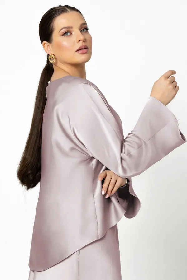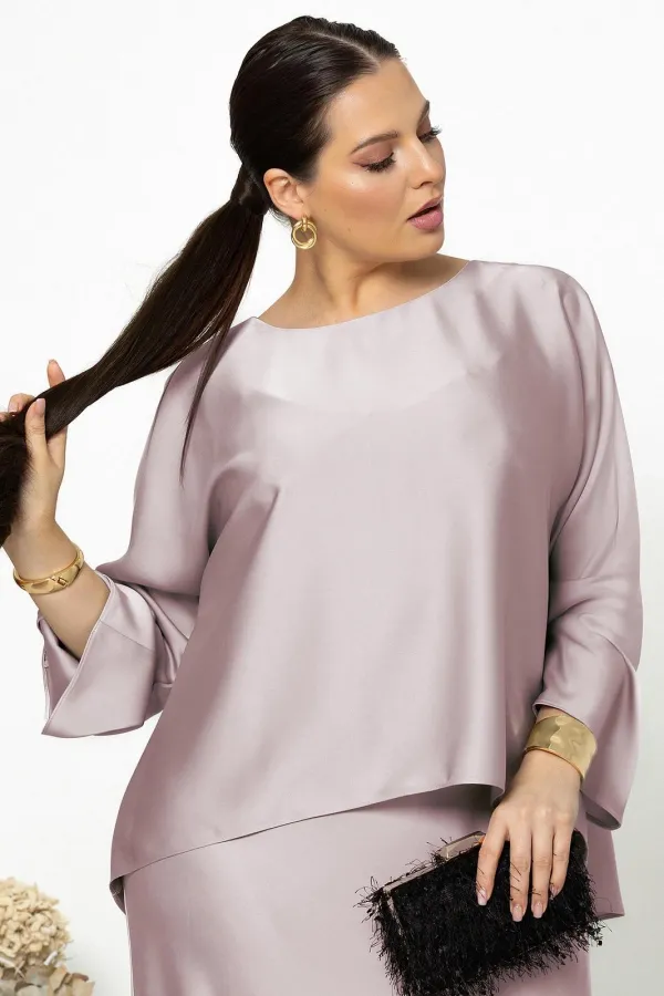 Блуза с округлым вырезом горловины, фигурным низом и цельнокроеными рукавами. Спинка с застёжкой на петлю с пуговицей от горловины.