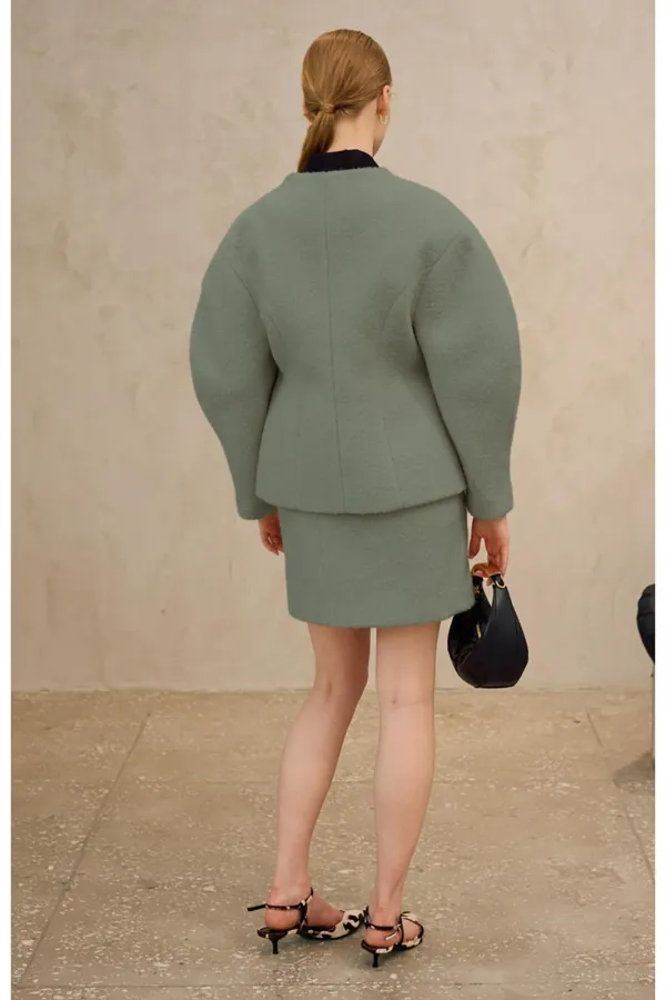 Комплект состоит из полупальто и юбки. Полупальто полуприлегающего силуэта на подкладке. Линия плеча спущена, рукав фигурной формы. Цельнокроеный воротник, переходящий в центральную застежку на потайные кнопки. По переду прорезные карманы с отлетными клапанами. По спинке средний шов и рельефы. Юбка в длине мини, прямого силуэта, на обтачке. По бокам прорезные карманы. По спинке средний шов, переходящий в потайную молнию.