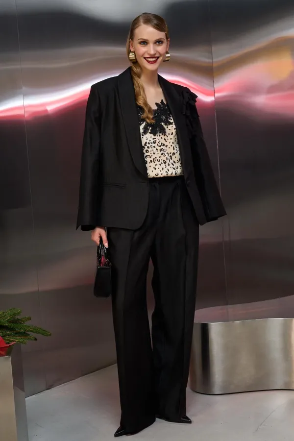 Костюм тройка, состоит из жакета, брюк и топа. Жакет свободного кроя, прямого силуэта на подкладке. Рукав длинный втачной, по локтевому шву шлица. Воротник шалька, центральная застежка на петли и пуговицы. По бокам прорезные карманы с клапаном. По спинке средний шов, переходящий в отлетную шлицу. Топ прямого силуэта, выполнен из блузочной ткани. По переду надстрочное кружево. Топ на регулируемых бретелях.