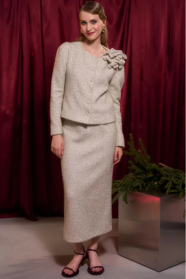 Комплект состоит из жакета и юбки и выполнен из трикотажного полотна с люрексом. Жакет прямого силуэта. Рукав втачной длинный, по верхней части рукава встречная складка. Округлый вырез горловины. Застежка на петли и пуговицы. Брошь-цветок съемная. Юбка длины миди прямого силуэта с резинкой на поясе.