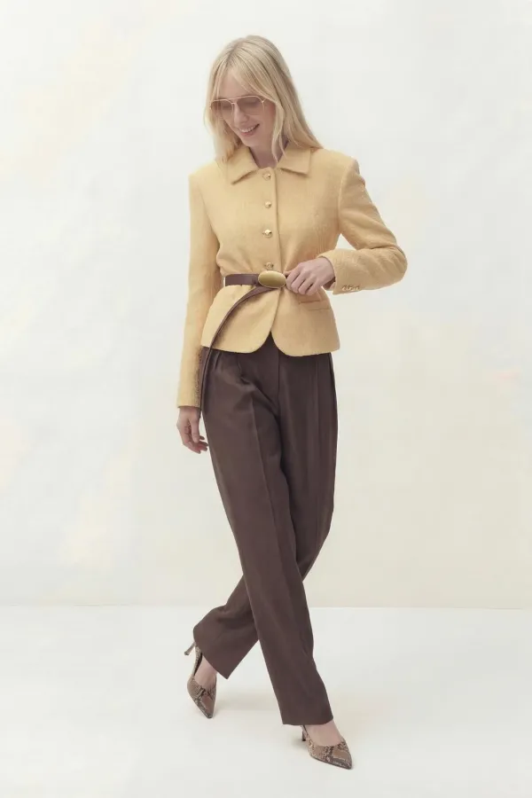 Жакет полуприлегающего силуэта с центральной застежкой на петли и пуговицы. Край борта фигурной формы. Рукав втачной длинный со шлицей. На шлице рукава пуговица. Воротник рубашечного кроя. По спинке средний шов и рельефы. Брюки свободного кроя, прямого силуэта, на притачном поясе. По переду глубокие складки, в боковых швах прорезные карманы. По задней половине брюк талевые вытачки. К комплекту прилагается съемный пояс коричневого цвета.