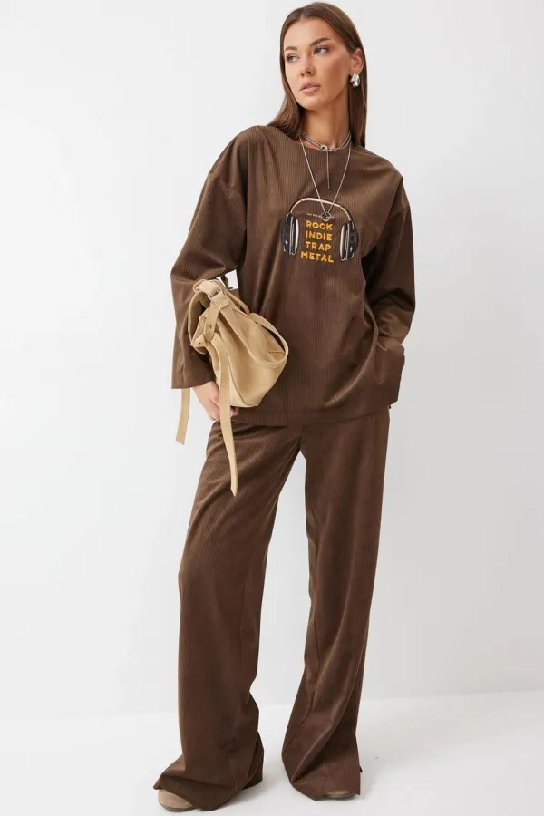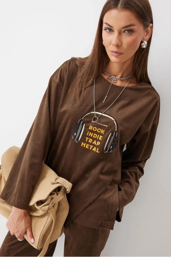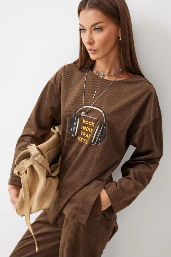 Комплект, состоящий из джемпера и брюк. Джемпер прямого силуэта из костюмной ткани. Горловина округлая, на спинке застежка в среднем шве. Рукав со спущенной линией плеча длинный. По низу джемпера в боковом шве шлица. Брю... Читать далее...