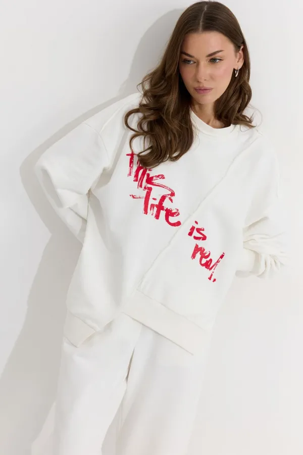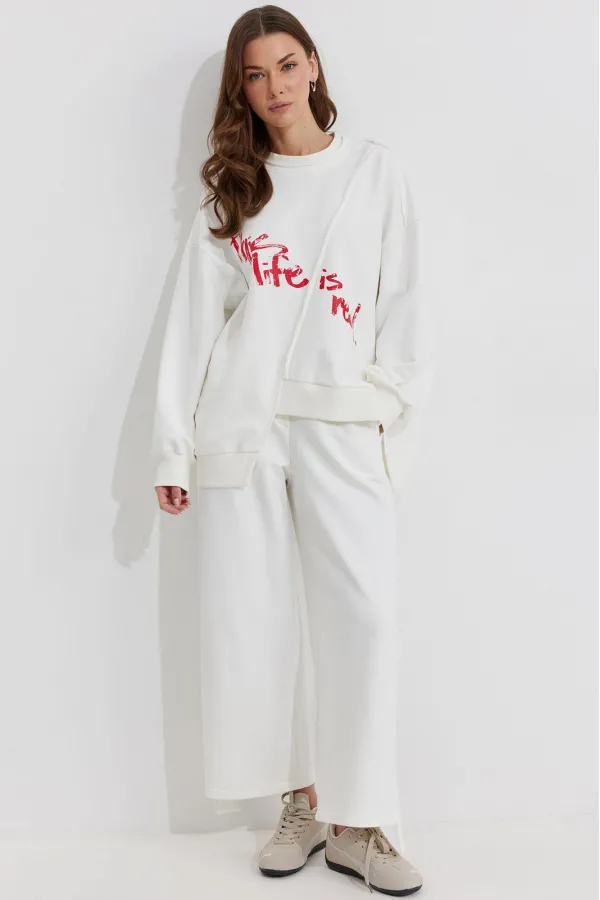 Костюм состоящий из джемпера и брюк.Ассиметричный джемпер прямого силуэта из трикотажного полотна. Горловина округлая. Рукав со спущенной линией плеча . По переду и спинке декоративный шов, по низу пояс с нашивкой. По ни... Читать далее...