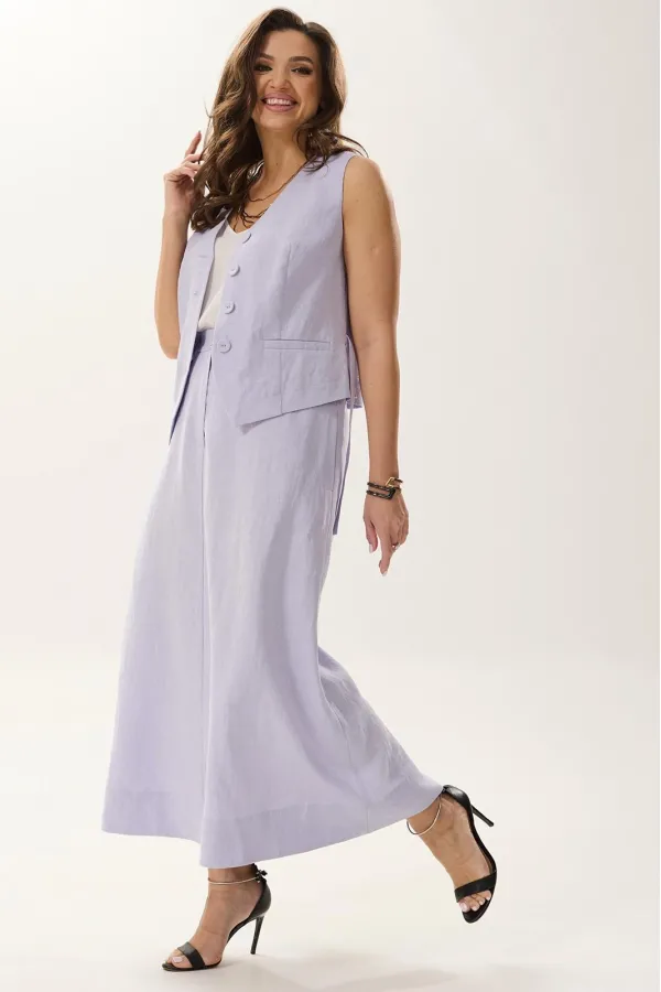 Комплект женский, состоящий из жилета и юбки. Жилетка со средним швом по спинке, переходящим в разрез. Завязывается сзади на пояс. По переду вытачки, переходящие в рельеф. V-образная горловина, фигурный низ, карманы с листочкой, функциональные, застежка на 4 пуговицы. Юбка А-силуэта со средним швом по спинке и переду. В боковых обработаны карманы, пояс на резинке, застежка на молнию и пуговицы.