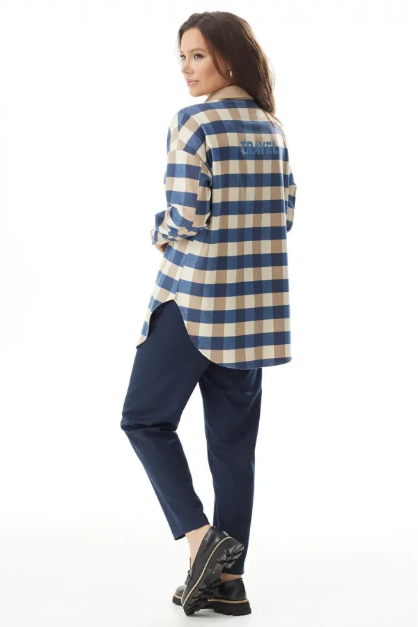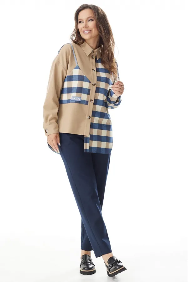 Стильный комплект из блузы и брюк. Блуза рубашечного кроя с центральной застежкой на пришивные пуговицы. Оригинальное сочетание однотона и клетки делает образ очень стильным. Брюки классического кроя, с притачным поясом, дополненным эластичной тесьмой, с застежкой на пришивную пуговицу и молнию. Посадка средняя. Брюки слегка заужены книзу. Дополнены функциональными боковыми карманами. Длина блузы от плечевого шва длинной части 79 см., короткой 64 см. Длина рукава 62 см. Длина брюк по боковому шву 98 см.
