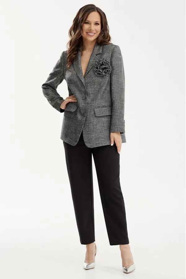 Жакет прямого кроя, на подкладке. с центральной застежкой на пришивные пуговицы. Дополнен боковыми карманами с клапанами. Рукав втачной. Жакет украшен брошью ручной работы, выполненной из основной ткани. Брюки классического кроя с притачным поясом, дополненным эластичной тесьмой, с застежкой на пришивную пуговицу и молнию. К низу брюки слегка заужены. Посадка средняя. Дополнены функциональными боковыми карманами. Длина жакета от плечевого шва 70 см. Длина рукава 60 см. Длина брюк по боковому шву 97 см.