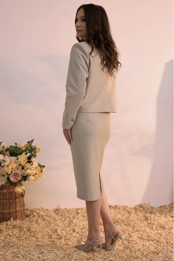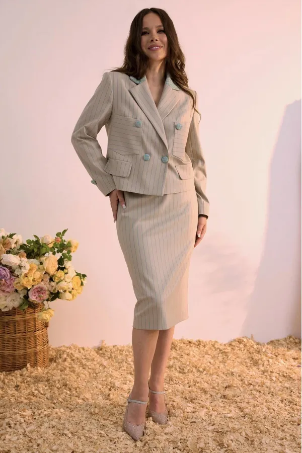 Стильный комплект из жакета и брюк. Жакет двубортный прямого кроя, на подкладке, слегка укорочен. Классический воротник и застежка на пуговицы создают стильный и универсальный силуэт, который легко комбинируется как с брюками прямого кроя , так и с юбкой. Рукав втачной. Жакет дополнен отделкой из рогожки бирюзового цвета, что придает образу уникальность. Юбка классического кроя, на подкладке, с притачным поясом, дополненным эластичной тесьмой. По спинке застежка на потайную молнию и пуговицу. Так же юбка дополнена удобным разрезом. Длина жакета от плечевого шва 57см. Длина рукава 60см. Длина юбки 73см.