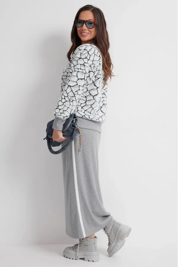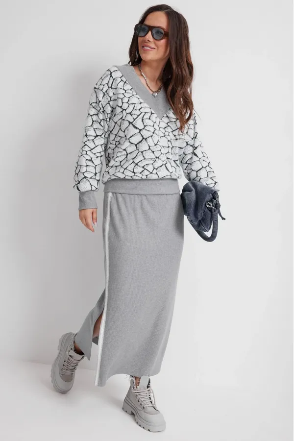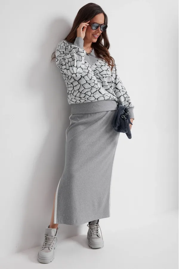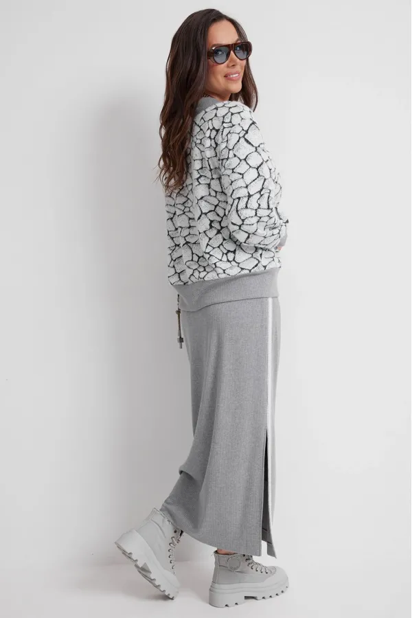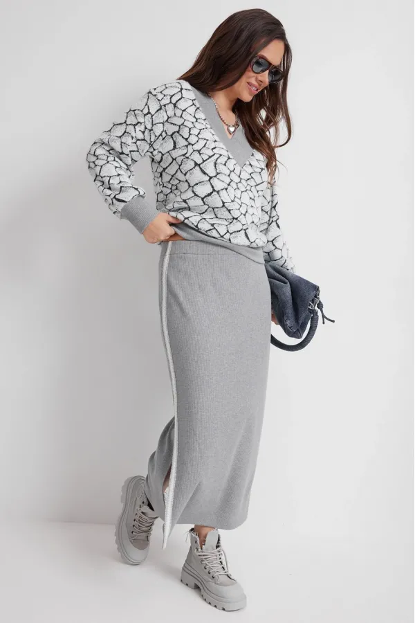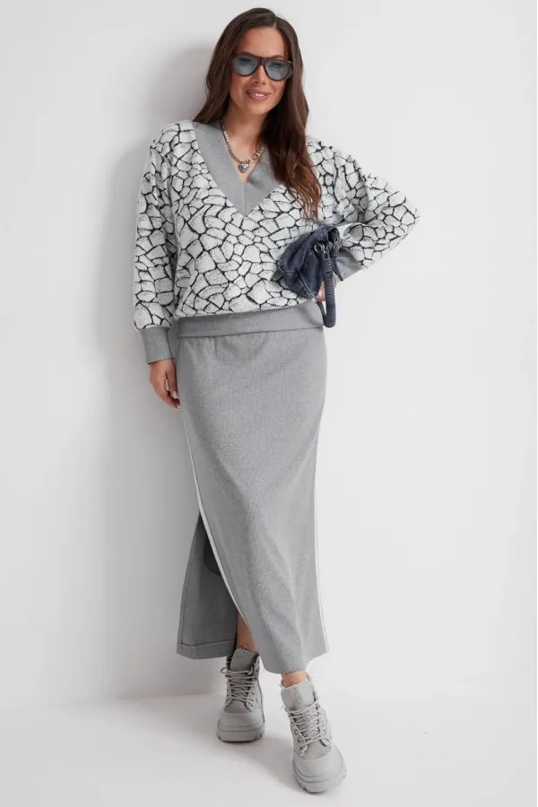 Стильный трикотажный комплект из джемпера и юбки. Джемпер свободного кроя. Выполнен из нежного, слегка пушистого , трикотажа. Горловина V- образная, обработана довязом. Рукав втачной, дополнен притачной манжетой. Низ джемпера слегка присборен и обработан притачным довязом. Юбка макси с одним боковым разрезом. Выполнена из приятного к телу трикотажа в рубчик. Дополнена отделкой из тесьмы по боковым швам. Юбка с притачным поясом, дополненным эластичной тесьмой. Длина джемпера от плечевого шва 65см. Длина рукава 62см. Длина юбки по боковому шву 90см.