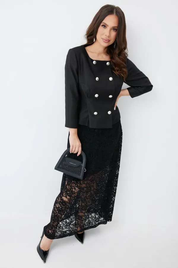 Нарядный комплект из жакета и кружевной юбки. Двубортный жакет полуприлегающего силуэта, на подкладке. Рукав длинный, втачной. Центральная застежка на красивые пришивные пуговицы. Юбка А-образного силуэта. Выполнена из красивого бархатного кружева на комфортной к телу подкладке. Юбка с притачным поясом, дополненным эластичной тесьмой. Застежка на потайную молнию и пуговицу. Длина жакета от плечевого шва 53см. Длина рукава 54см. Длина юбки 94см.