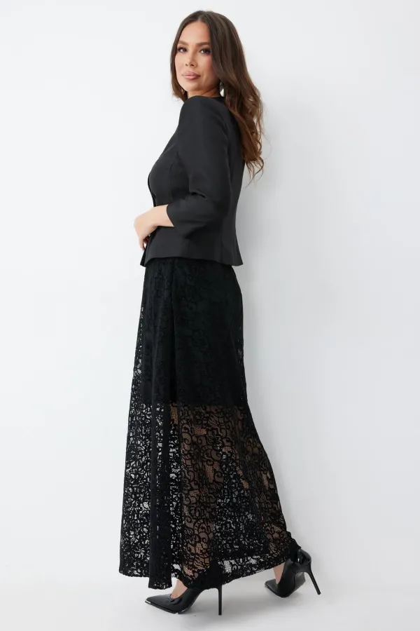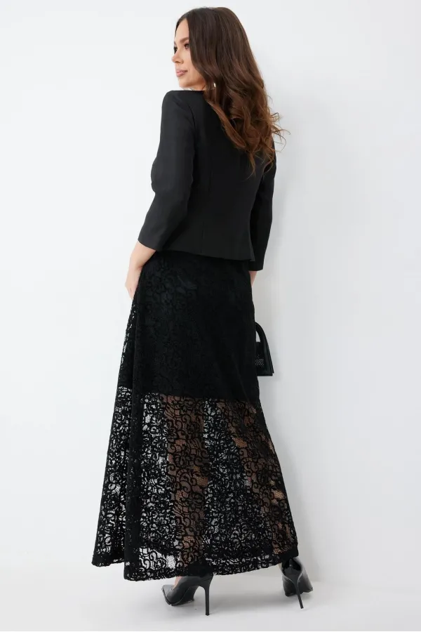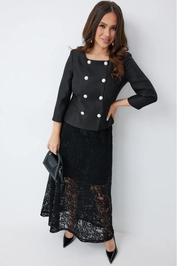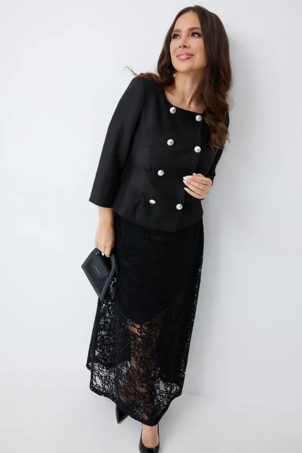 Нарядный комплект из жакета и кружевной юбки. Двубортный жакет полуприлегающего силуэта, на подкладке. Рукав длинный, втачной. Центральная застежка на красивые пришивные пуговицы. Юбка А-образного силуэта. Выполнена из к... Читать далее...