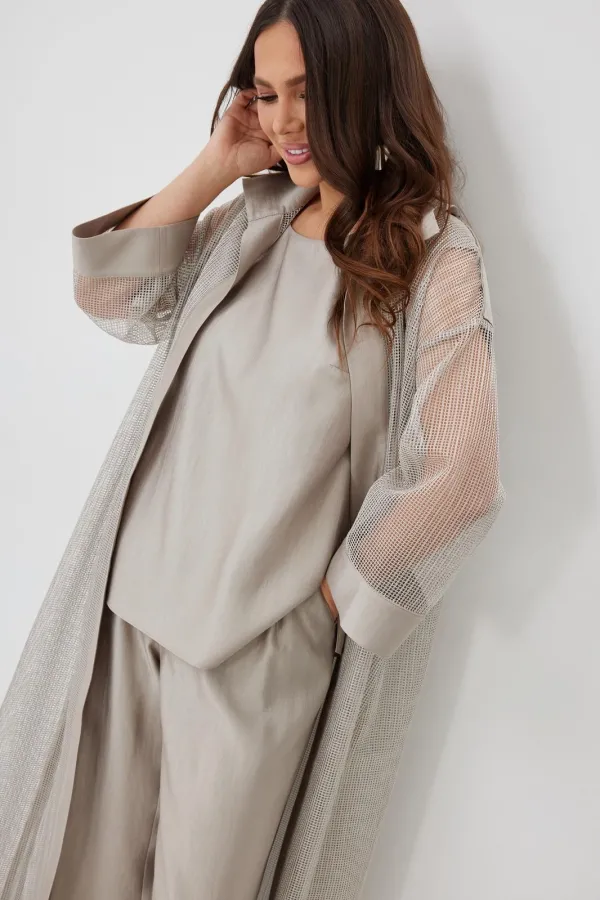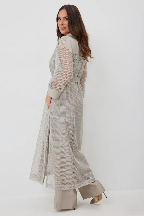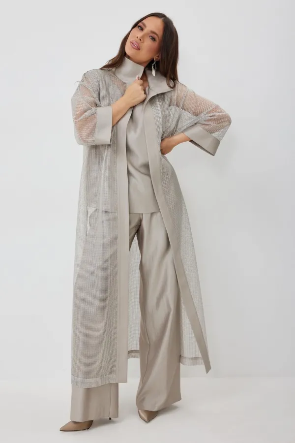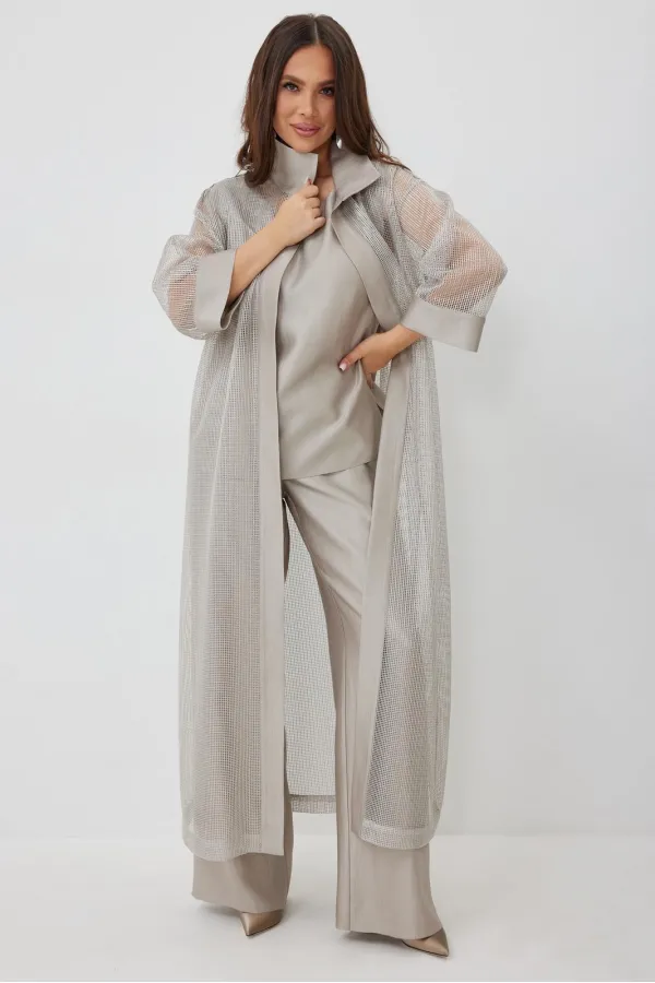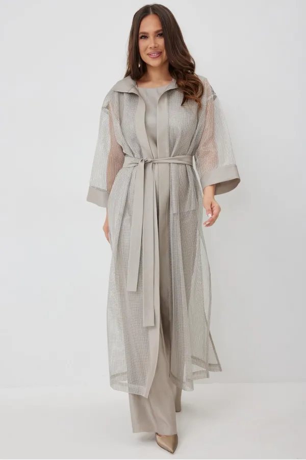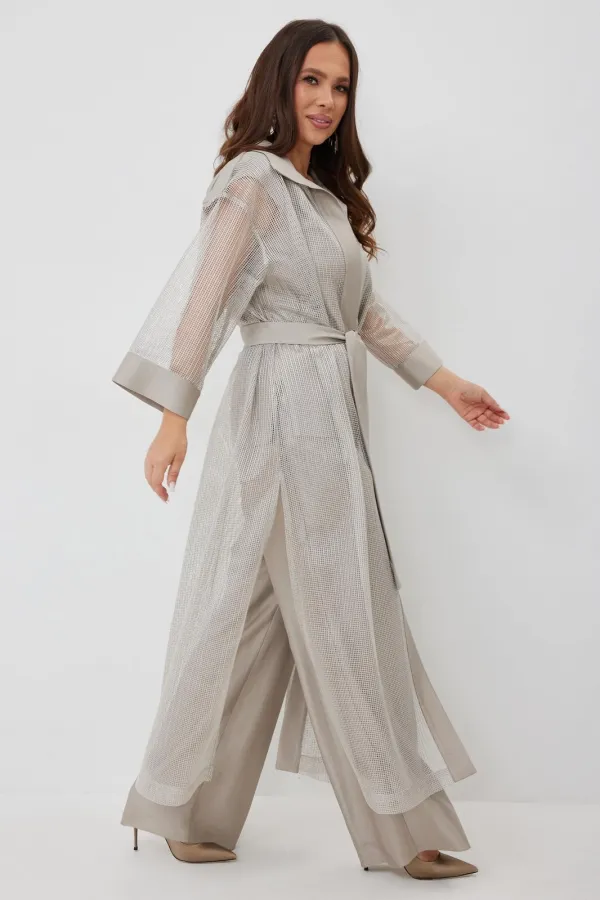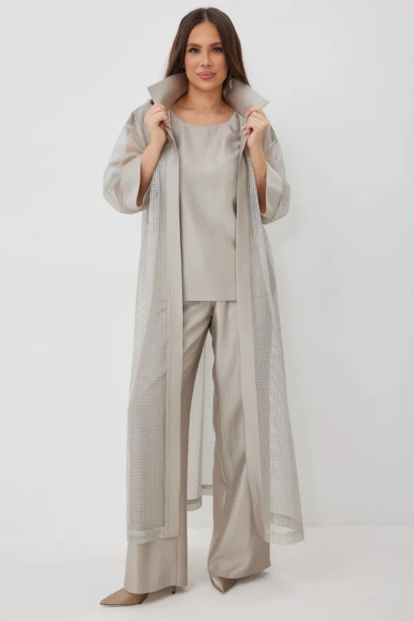 Стильный комплект из длинного кардигана, топа и брюк. Кардиган свободного прямого кроя с разрезами. Выполнен из текстильной сетки с отделкой из гладкой костюмной ткани. Рукав втачной, слегка спущен. Дополнен съемным пояс... Читать далее...