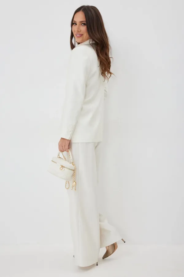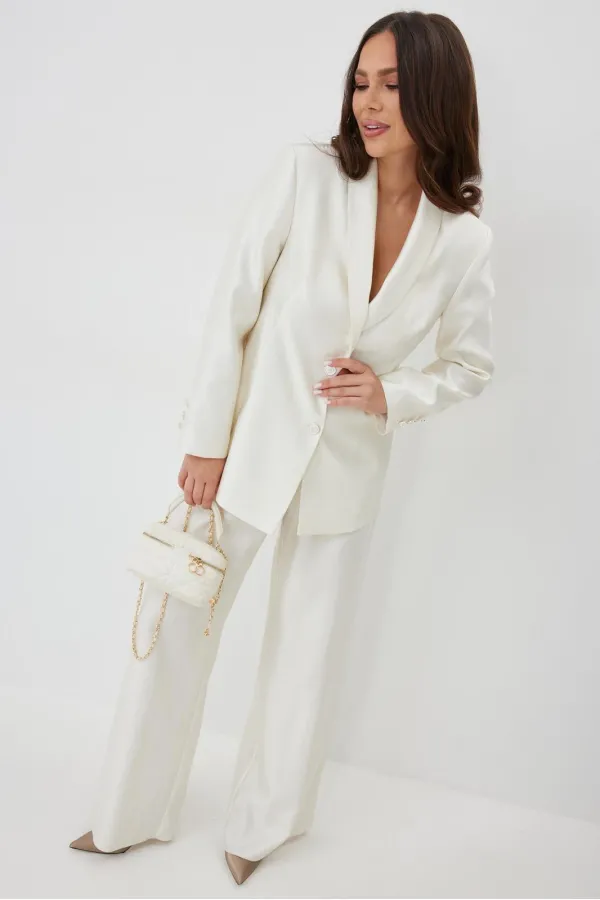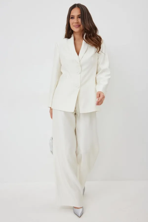 Элегантный и безумно красивый костюм из жакета и брюк. Выполнен из красивой гладкой костюмной ткани с легким жемчужным отблеском. Жакет прямого свободного кроя с красивыми рельефами, на подкладке, с центральной застежкой на пуговицы. Брюки классического прямого кроя с притачным поясом, дополненным эластичной тесьмой. Дополнены удобными боковыми и задними карманами. Застежка гульфик на молнию и пришивную пуговицу. Длина жакета от плечевого шва 73 см. Длина рукава 60см. Длина брюк 107 см