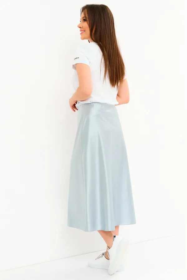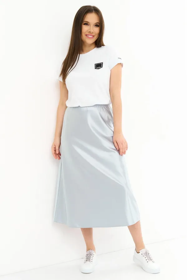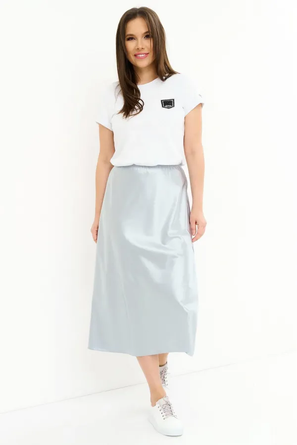 Стильный комплект из хлопковой базовой футболки и юбки миди. Футболка прямого классического кроя с втачным коротким рукавом. Дополнена нагрудной аппликацией. Юбка А-силуэта с застежкой на молнию в боковом шве. Без подкладки. Выполнена из струящегося плотного полотна с атласным блеском. Длина футболки от плечевого шва 57 см. Длина рукава 12 см. Длина юбки 79 см.