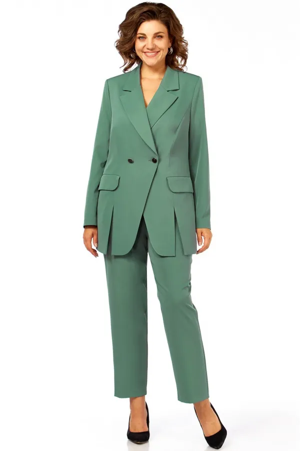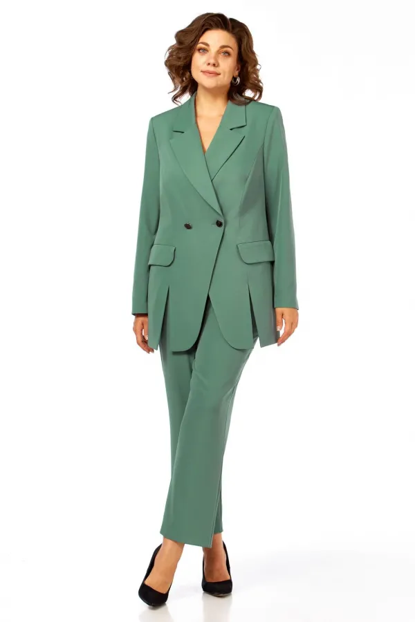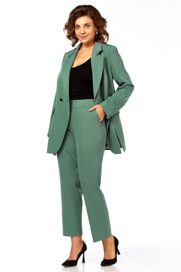 Комплект женский 2-х предм., состоящий из жакета и брюк. Жакет женский прямого силуэта, с плечевыми накладками на притачной подкладке. По переду выполнены рельефы переходящие в разрезы. На уровне линии талии выполнены прорезные карманы с листочкой и клапаном. По центру переда ассиметричная двухбортная застежка на петли пуговицы. Рукав втачной, двухшовный, длинный. Воротник пиджачного типа. Брюки слегка заужены к низу, на круговой резинке по поясу, с вытачками по переду, и карманами-хулиганами, с листочкой с настрочными концами, в боковых швах.