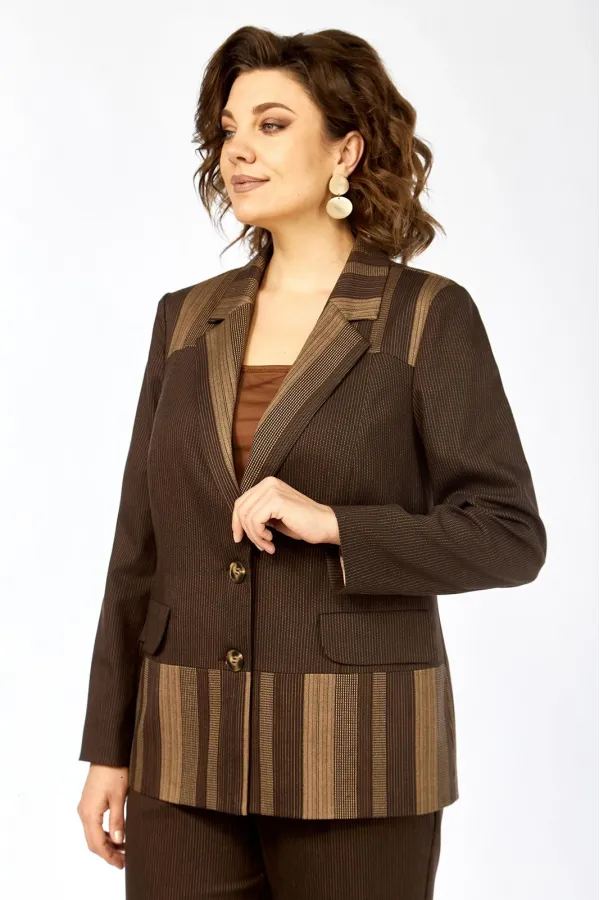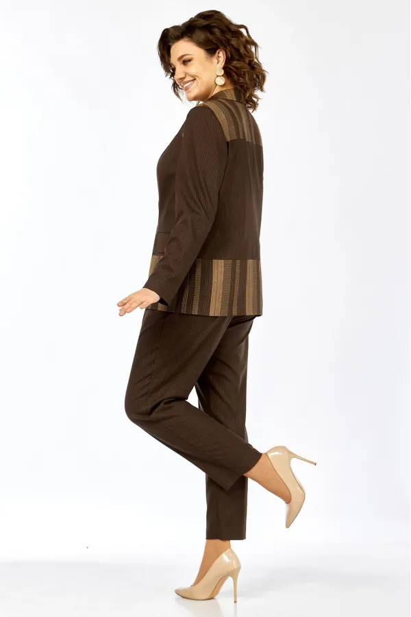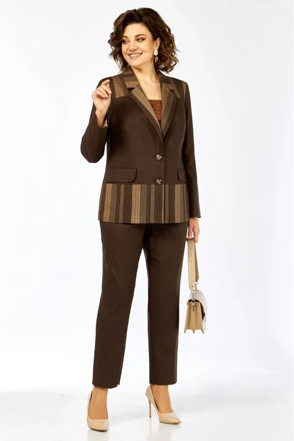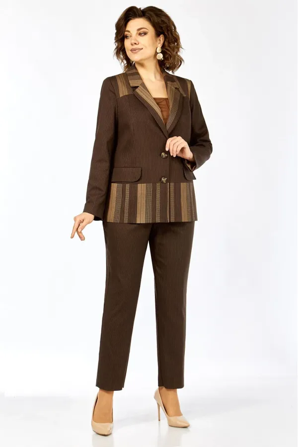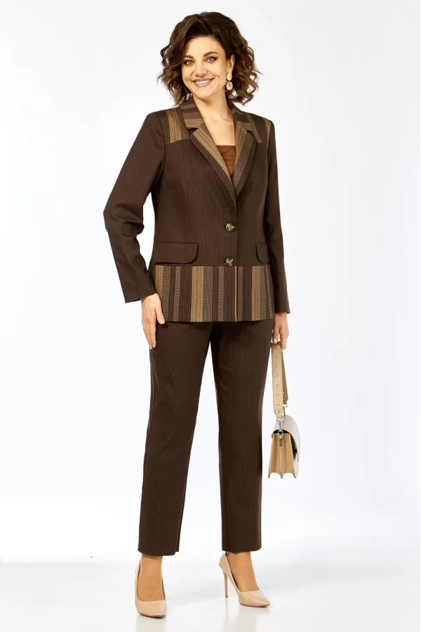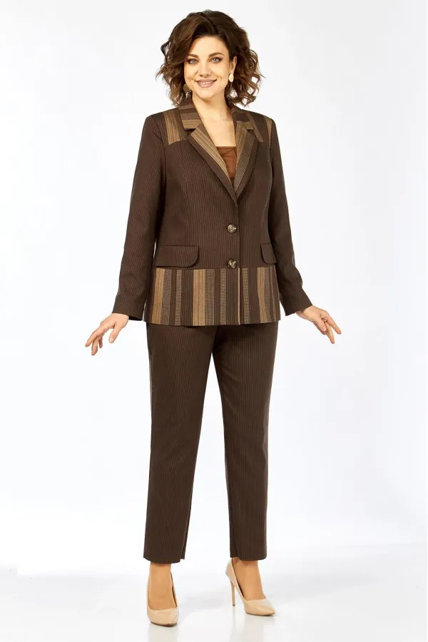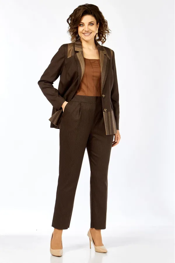 Комплект женский 2-х предметный, состоящий из жакета и брюк. Жакет на подкладке, с центальной застежкой на 2 пуговицы, воротником пиджачного типа. Перед с отрезными кокетками, отрезной баской и рельефами от кокетки до баски переда. По переду имеются прорезные карманы с клапанами. Спинка с кокеткой, баской по низу и средним швом от кокетки до баски. Рукав втачной, двухшовный. Брюки слегка заужены к низу. Имеются карманы-хулиганы в боковых швах. Брюки на отрезном поясе, пояс по спинке и частично по переду на резинке.