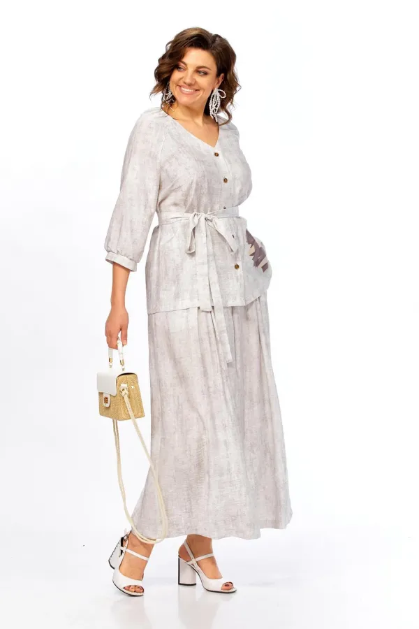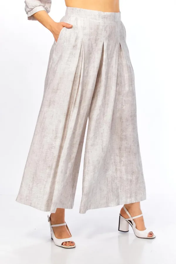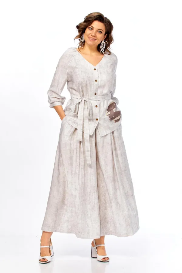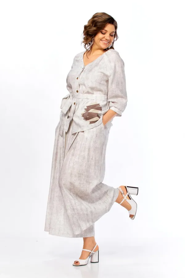 Юбка-брюки, длиной 7/8, на отрезном поясе, по спинке -резинка, карманы в боковых швах. По переду имеются 3 встречные складки. Комплект с мягкозавязывающимся поясом