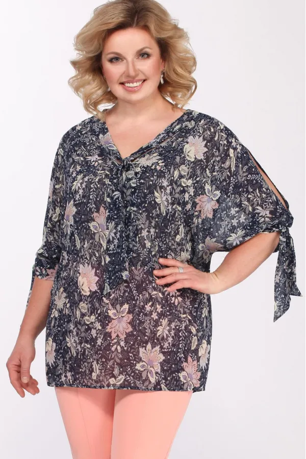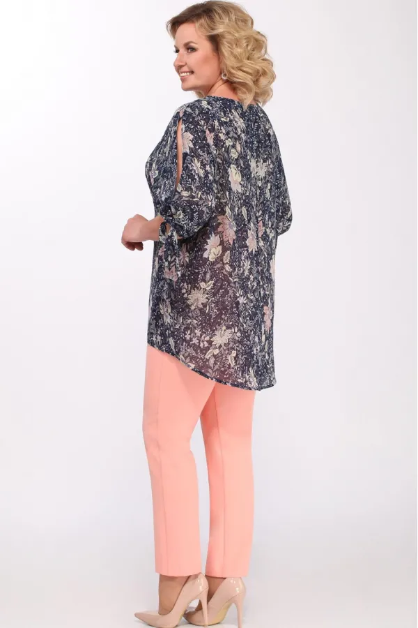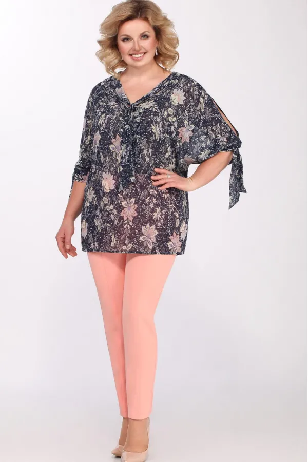 Комплект женский,состоит из блузки и топа. Блузка без застежки,рукав цельнокроеный с разрезом. Низ рукава на завязывающихся манжетах. вырез горловины V-образный обработан окантовкой. воротник-шаль,завязывается по переду. Низ блузки фигурный. Топ на бретелях. Длина блузона по спинке 80см, ширина рукава на уровне глубины проймы 58-38,6, 60-40см, 62-41,4см. Реальные параметры блузона ширина изделия на уровне глубины проймы 35см от основания шеи 58-150см, ширина внизу изделия 142см, ширина изделия на уровне глубины проймы 35см от основания шеи 60-154см, ширина изделия внизу 146см, ширина изделия на уровне глубины проймы 35см от основания шеи 62-158см, ширина изделия внизу 150см. Длина топа по спинке 49см,от плечевого шва 70см. Реальные параметры топа 58 ог-114см, ширина внизу 130см, 60 ог-118см, ширина внизу 133см, 62 ог-122см, ширина внизу 137см.