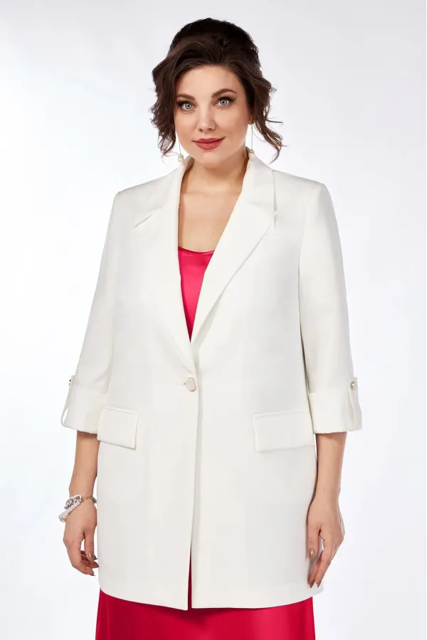 Комплект женский 2-х предметный, состоящий из платья-комбинации и жакета. Платье полуприлегающего силуэта, из плотной атласной ткани. Длина миди, с нагрудными вытачками из боковых швов и с округлым вырезом горловины по переду и спинке, на тонких регулирующихся бретелях. Жакет женский, на подкладке, спинка со средним швом. Застежка жакета на 1 петлю и пуговицу. Перед с нагрудными вытачками из боковых швов, и прорезными карманами с клапанами и рамками. Воротник пиджачный, линия конца воротника выходит за линию уступа лацкана, образуя эффект - внахлест. Рукав втачной 2-х шовный, длиной 3/4. Рукав с широкой отложной манжетой на пату и пуговицу.