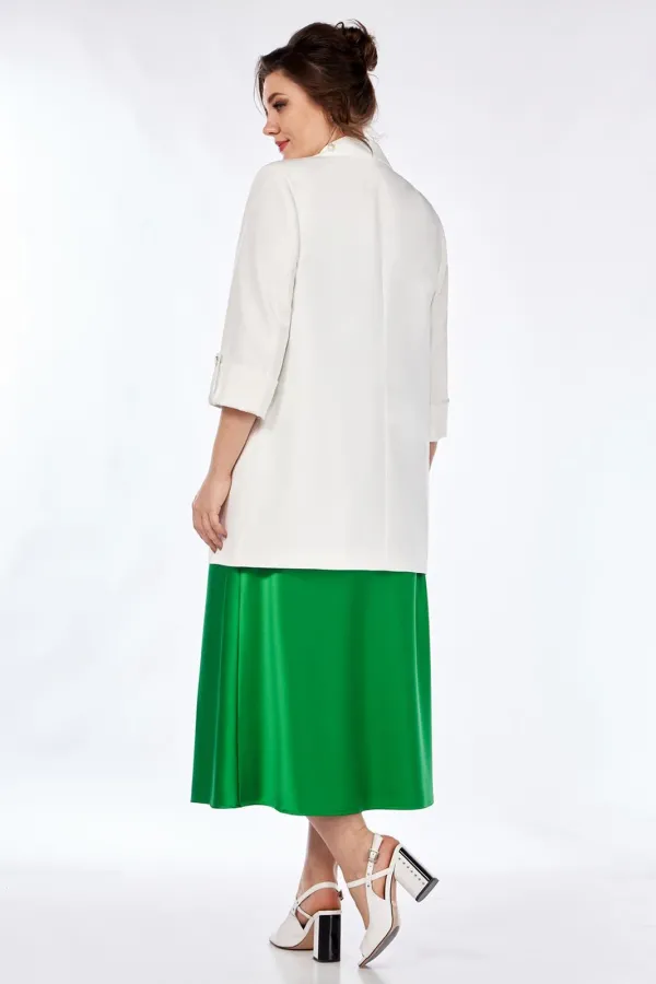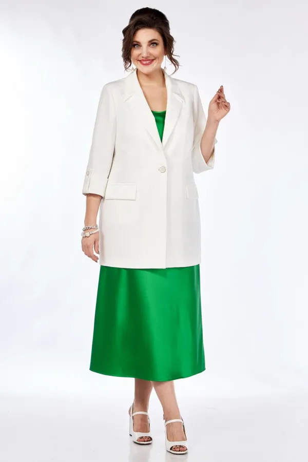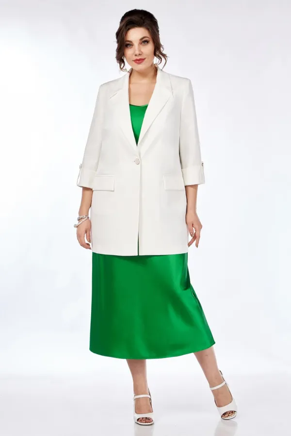 Комплект женский 2-х предметный, состоящий из платья-комбинации и жакета. Платье полуприлегающего силуэта, из плотной атласной ткани. Длина миди, с нагрудными вытачками из боковых швов и с округлым вырезом горловины по переду и спинке, на тонких регулирующихся бретелях. Жакет женский, на подкладке, спинка со средним швом. Застежка жакета на 1 петлю и пуговицу. Перед с нагрудными вытачками из боковых швов, и прорезными карманами с клапанами и рамками. Воротник пиджачный, линия конца воротника выходит за линию уступа лацкана, образуя эффект - внахлест. Рукав втачной 2-х шовный, длиной 3/4. Рукав с широкой отложной манжетой на пату и пуговицу.