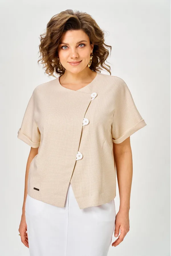 Короткий жакет с асимметричным запахом — современное воплощение легкости и женственности. Застежки на подвесные петли с пуговицами придают деталям особый шарм, а свободный силуэт создает ощущение невесомости и комфорта.