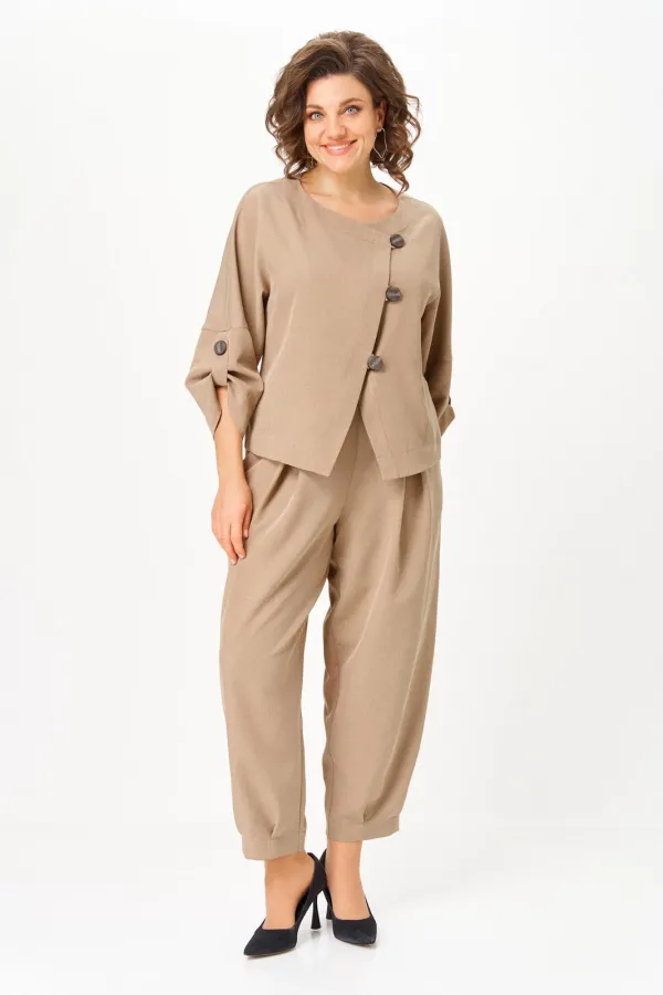 Универсальный костюм, который выглядит дорого и современно, но при этом дарит комфорт и лёгкость. Его можно носить как комплект или по отдельности: жакет с асимметричной застёжкой и акцентными пуговицами легко сочетается с джинсами, а брюки свободного кроя идеально смотрятся с блузой или футболкой.