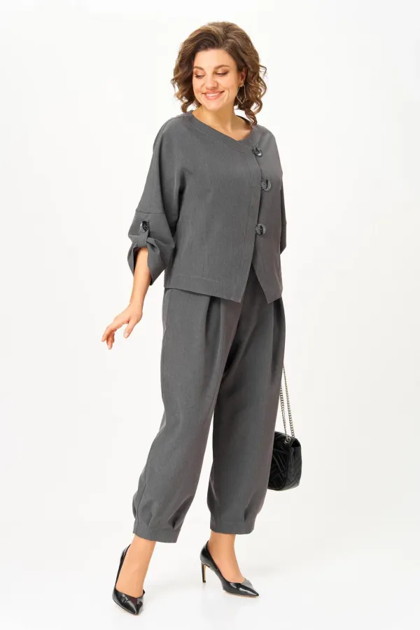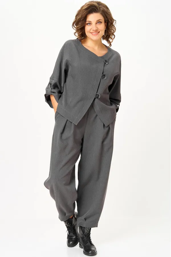 Универсальный костюм, который выглядит дорого и современно, но при этом дарит комфорт и лёгкость. Его можно носить как комплект или по отдельности: жакет с асимметричной застёжкой и акцентными пуговицами легко сочетается с джинсами, а брюки свободного кроя идеально смотрятся с блузой или футболкой.