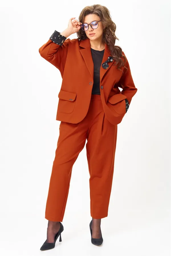 Костюм, который подчеркивает вашу уверенность и женственность. Плотный трикотаж с добавлением нейлона делает его пластичным и износостойким — он держит форму и смотрится дорого в любой ситуации. Богатый карамельный оттенок словно создан, чтобы добавить тепла и выразительности в повседневность, а изящная отделка текстилем и контрастные детали на лацкане и манжетах превращают образ в по-настоящему уникальный.
