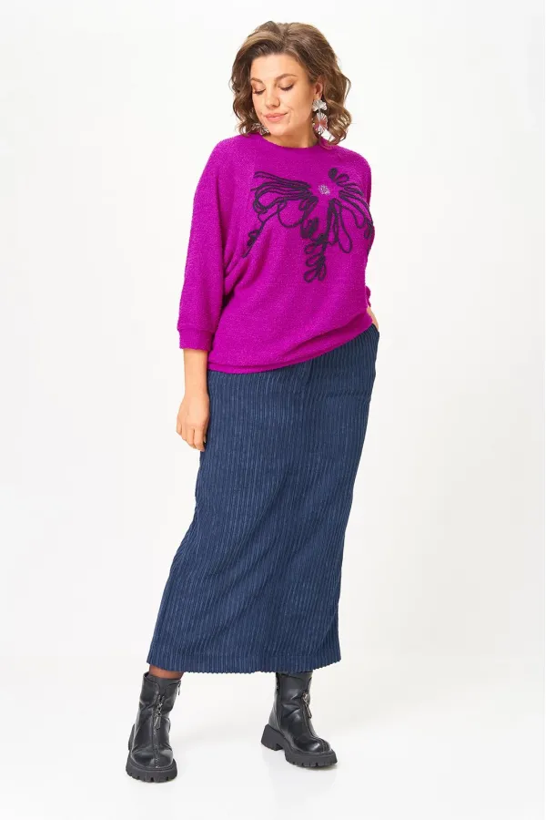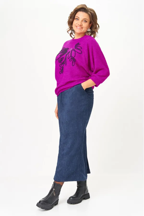 Этот элегантный и модный комплект станет ярким акцентом в вашем гардеробе! Комплект включает в себя яркий пурпурный джемпер с рукавами реглан «летучая мышь» и изящную юбку в темно-синих тонах, выполненную из мягкого, приятного к телу вельвета.