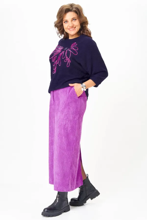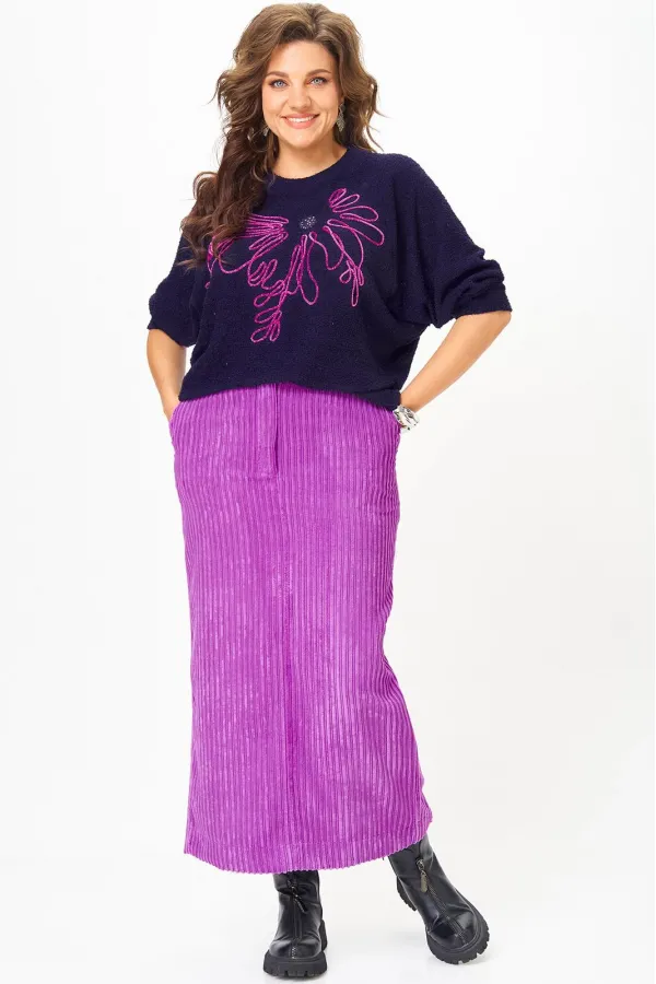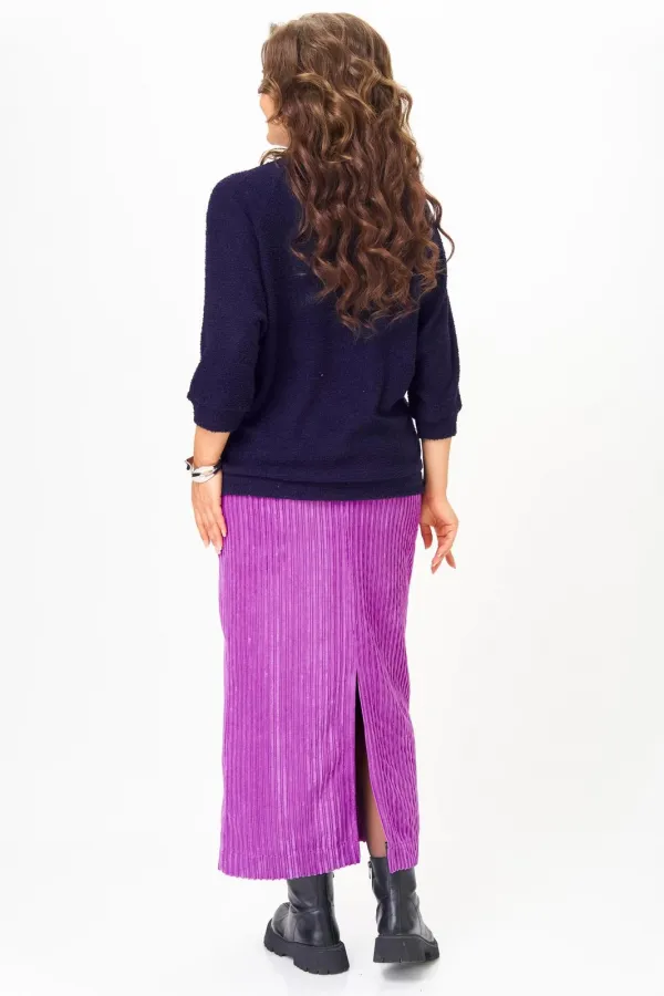 Этот элегантный и модный комплект станет ярким акцентом в вашем гардеробе! Комплект включает в себя яркий пурпурный джемпер с рукавами реглан «летучая мышь» и изящную юбку в темно-синих тонах, выполненную из мягкого, приятного к телу вельвета.
