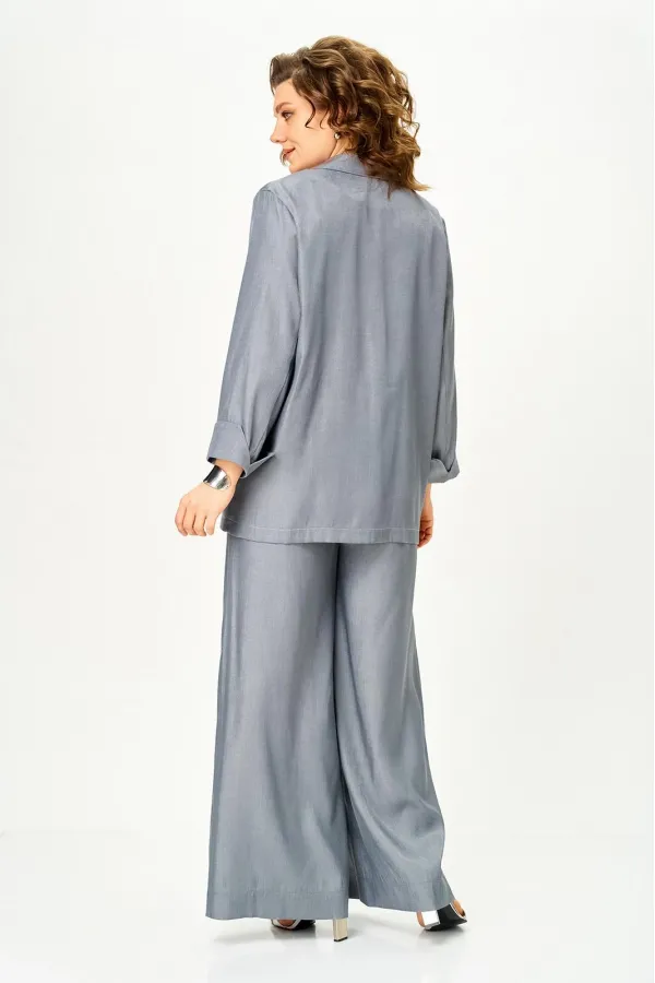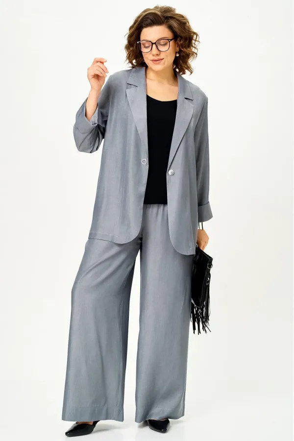 Есть вещи, которые сразу работают на образ. Этот костюм выбирают женщины, которым важны статус и лёгкость без суеты. Вертикальная полоска визуально вытягивает силуэт и стройнит, а струящаяся ткань красиво ведёт линию движения. Удлинённый жакет застёгивается на одну пуговицу — актуальный акцент сезона, который подчёркивает талию и делает силуэт современным.