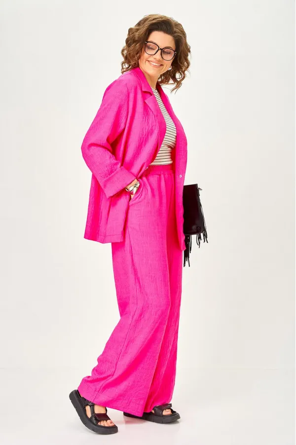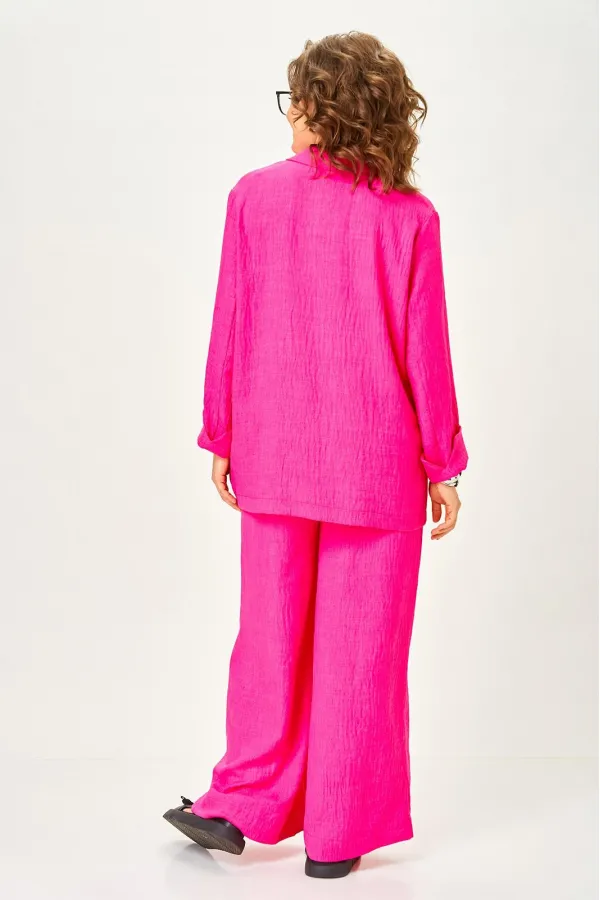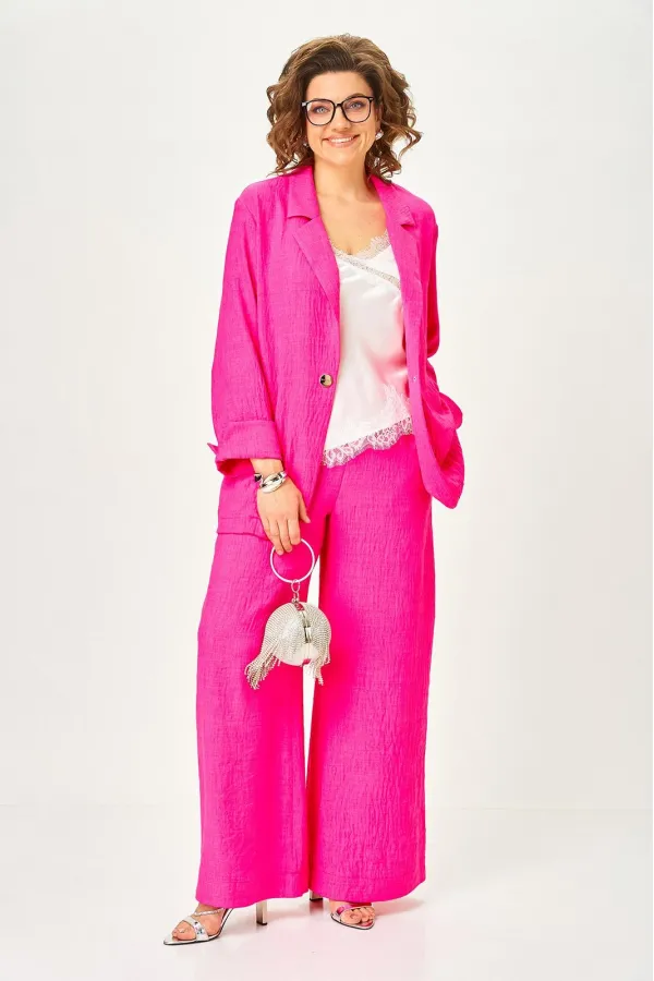 Ткань мягко струится, при этом держит форму и красиво формирует силуэт. Благодаря лёгкости материала костюм комфортен в течение дня и остаётся актуальным в разных сезонах.
