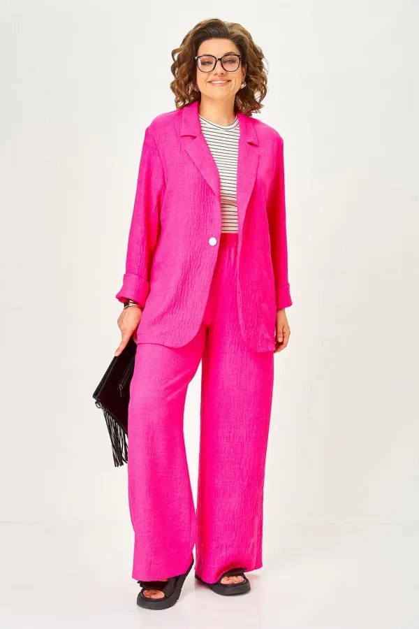 Длина жакета по спинке — 73 см+/- 1 см, длина рукава — 52/60 +/- 1 см, длина брюк по боковому шву — 108 см +/- 1 см, длина брюк по шаговому шву — 76 см +/- 1 см. Изделие подойдет на рост 164-170 см.