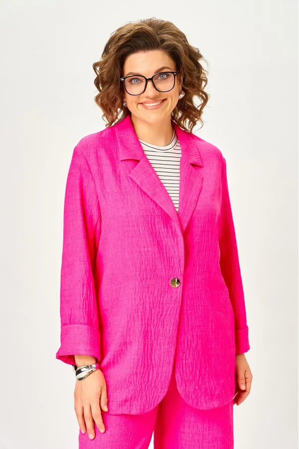 Жакет классического силуэта на одну кнопку, без подкладки — лёгкий и пластичный. Низ рукава скроен так, что его можно стильно отвернуть, создавая модную длину 7/8.