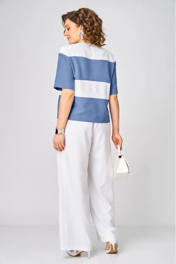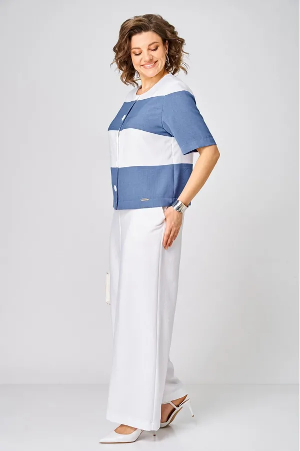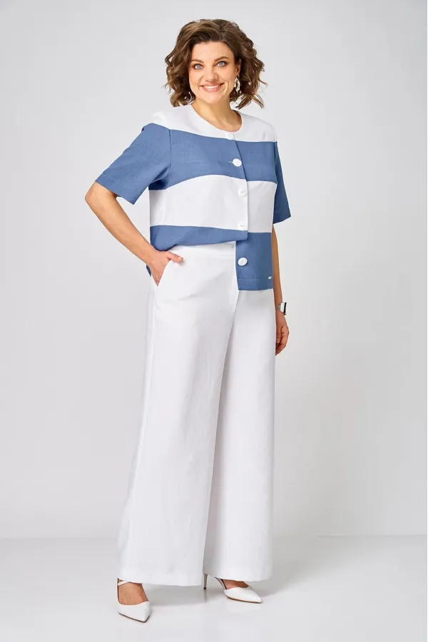 Жакет классического кроя на пуговицах можно носить соло (на топ/лиф) или вторым слоем — с сарафаном, блузой, майкой. Брюки-палаццо свободной посадки аккуратно выравнивают силуэт, мягко скрывая нюансы фигуры, при этом сохраняют лёгкость и статус.