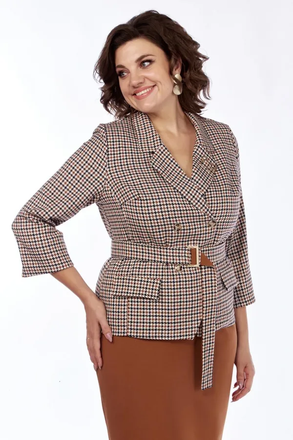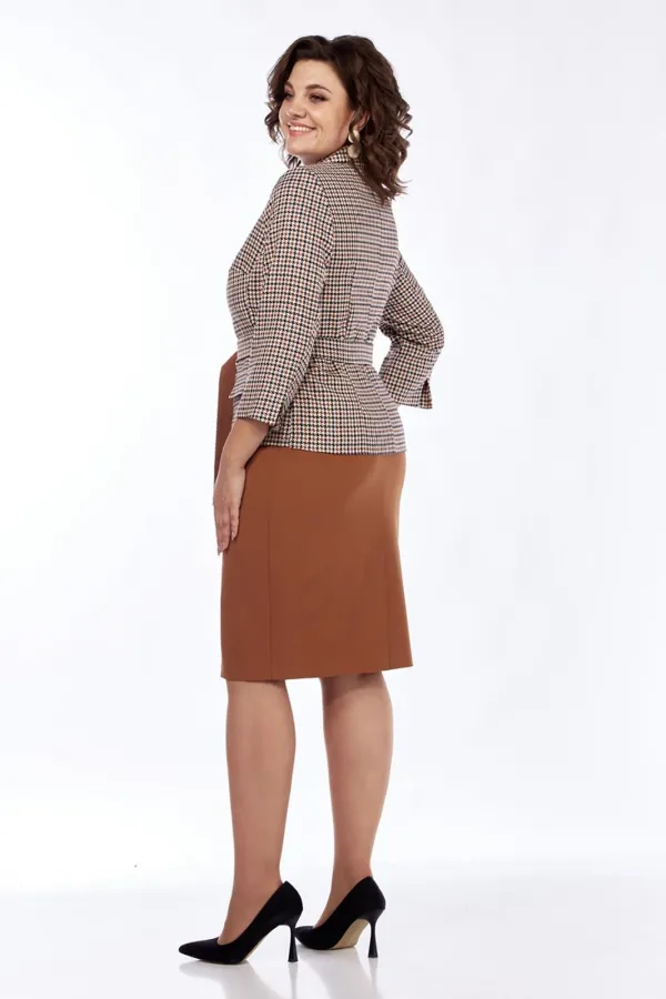 пиджачного типа. По переду-рельефный шов, нагрудная вытачка и клапан. Спинка со средним швом и талиевыми вытачками .Рукав двухшовный, по низу которого разрез. Жакет на частичной подкладке по переду . В качестве дополнения предлагается пояс. Юбка-карандаш прилегающего силуэта. По переду и спинке-талиевые вытачки. В среднем шве спинки-застежка на потайную тесьму-молнию и шлица. Юбка на подкладке. Длина по спинке-59см, длина рукава-51см. Длина юбки-66см