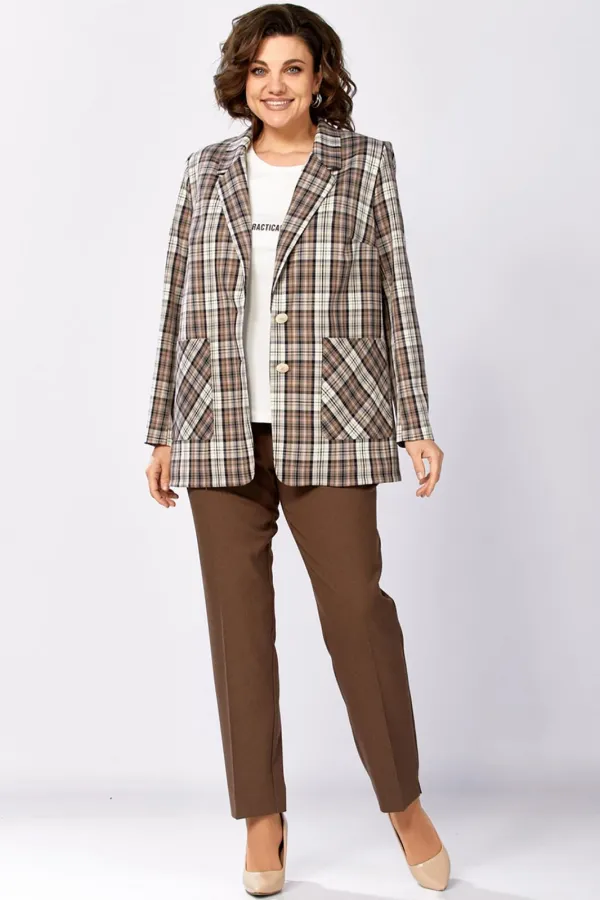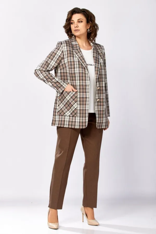 | Ткань | жакета: полиэстер - 64% вискоза - 34% эластан - 2%; состав брюк: полиэстер - 66% вискоза - 29% спандекс - 5%; состав футболки: вискоза - 60% пэ - 35% спандекс - 5% |