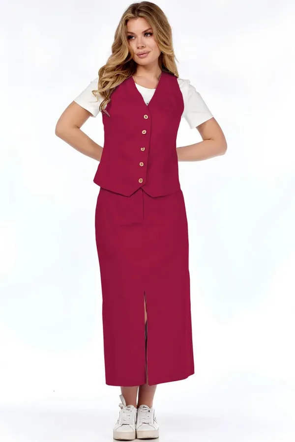 Комплект женский, состоящий из жилета, футболки и юбки. Жилет приталенного силуэта, без рукава, по переду с застёжкой на пуговицы, отделан двойными строчками. В области талии на спинке - декоративный хлястик. Футболка свободного силуэта. Округлый вырез горловины, рукав втачной, короткий. По переду декоративная печать. Юбка длинная с фиксированным поясом, застёжка на пуговицу с молнией. Имитация карманов. По переду разрез для удобства при ходьбе.