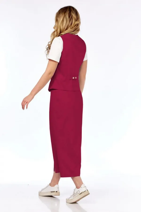 Комплект женский, состоящий из жилета, футболки и юбки. Жилет приталенного силуэта, без рукава, по переду с застёжкой на пуговицы, отделан двойными строчками. В области талии на спинке - декоративный хлястик. Футболка св... Читать далее...