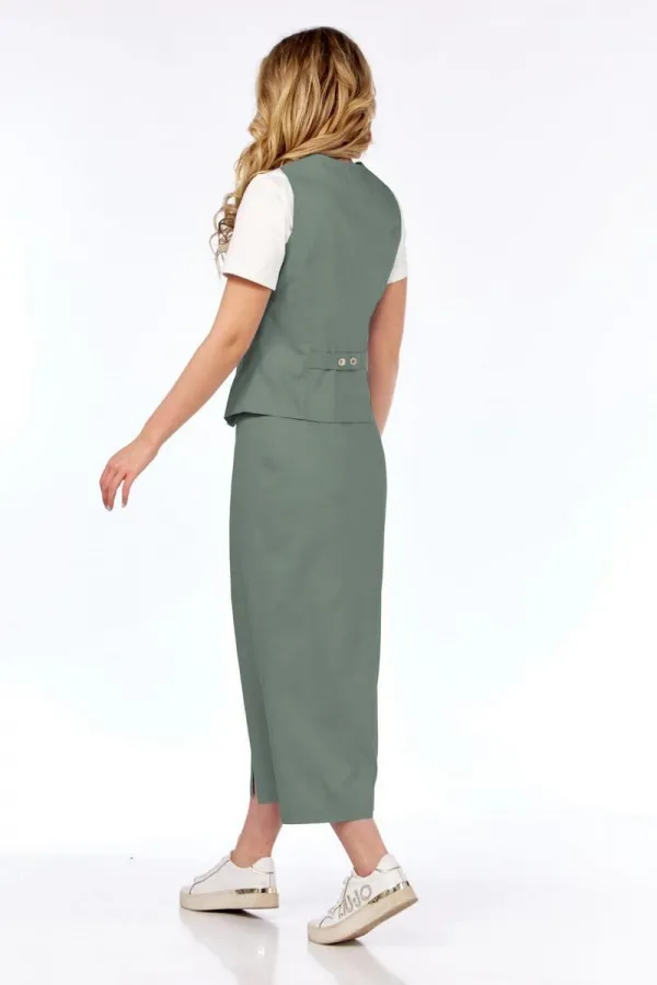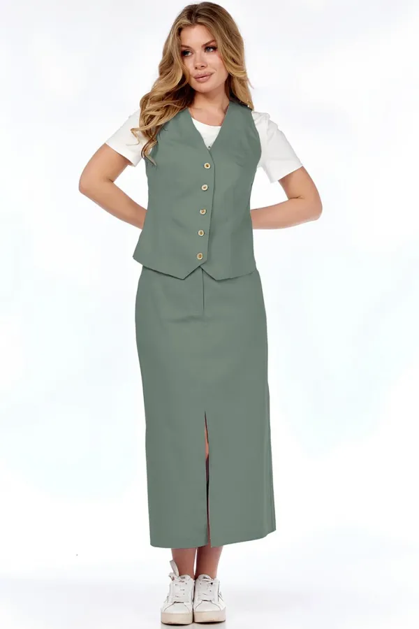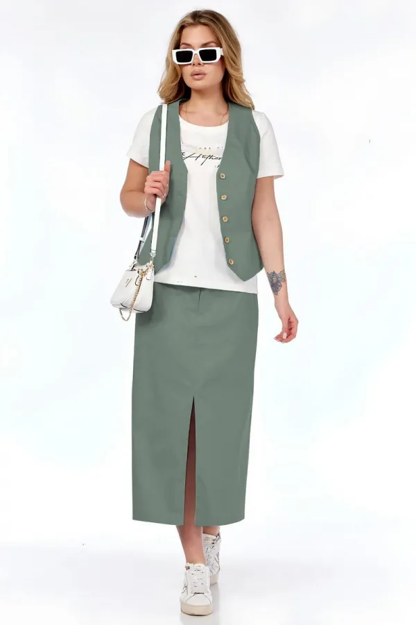 Комплект женский, состоящий из жилета, футболки и юбки. Жилет приталенного силуэта, без рукава, по переду с застёжкой на пуговицы, отделан двойными строчками. В области талии на спинке - декоративный хлястик. Футболка свободного силуэта. Округлый вырез горловины, рукав втачной, короткий. По переду декоративная печать. Юбка длинная с фиксированным поясом, застёжка на пуговицу с молнией. Имитация карманов. По переду разрез для удобства при ходьбе.