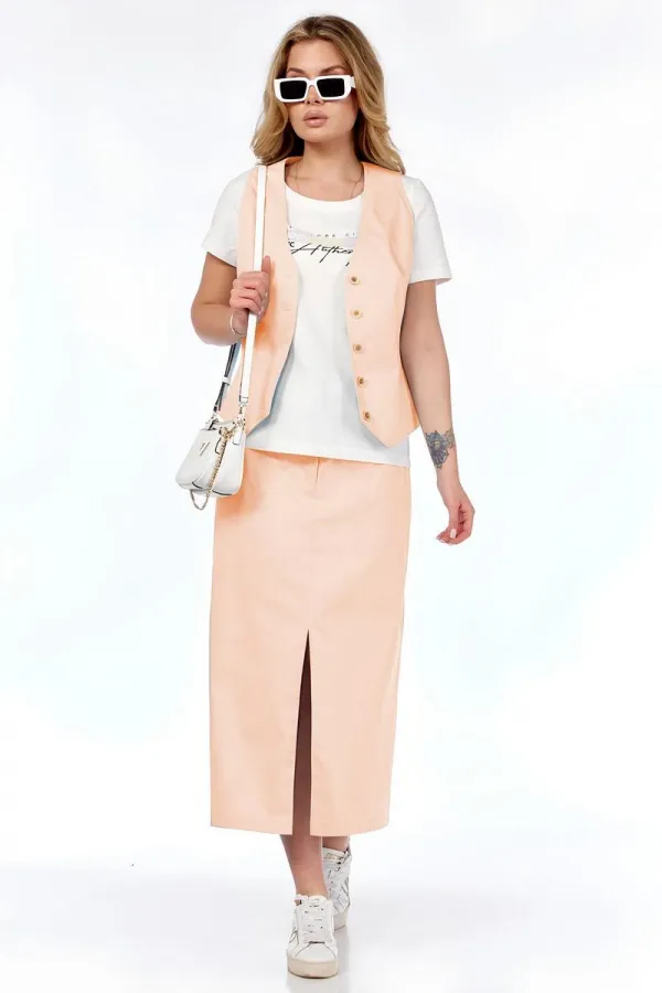 Комплект женский, состоящий из жилета, футболки и юбки. Жилет приталенного силуэта, без рукава, по переду с застёжкой на пуговицы, отделан двойными строчками. В области талии на спинке - декоративный хлястик. Футболка свободного силуэта. Округлый вырез горловины, рукав втачной, короткий. По переду декоративная печать. Юбка длинная с фиксированным поясом, застёжка на пуговицу с молнией. Имитация карманов. По переду разрез для удобства при ходьбе.