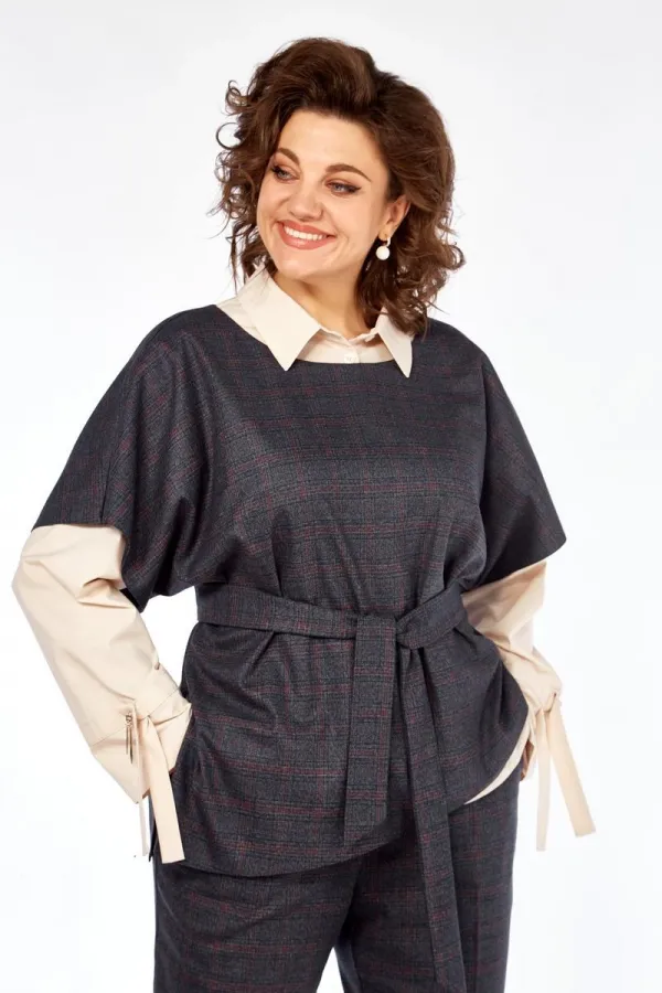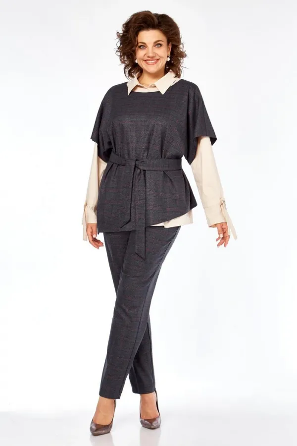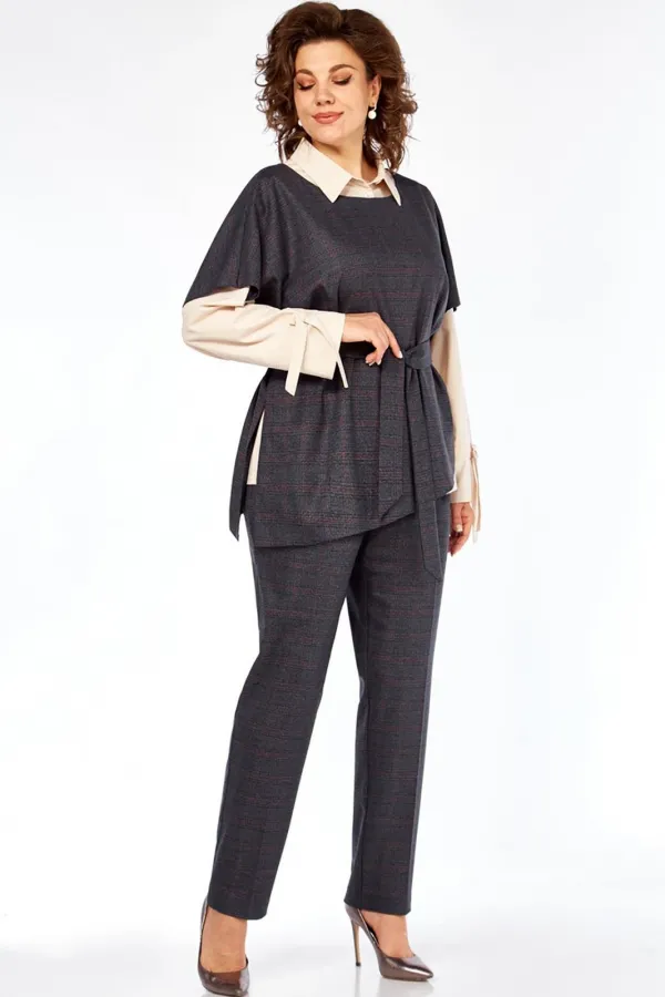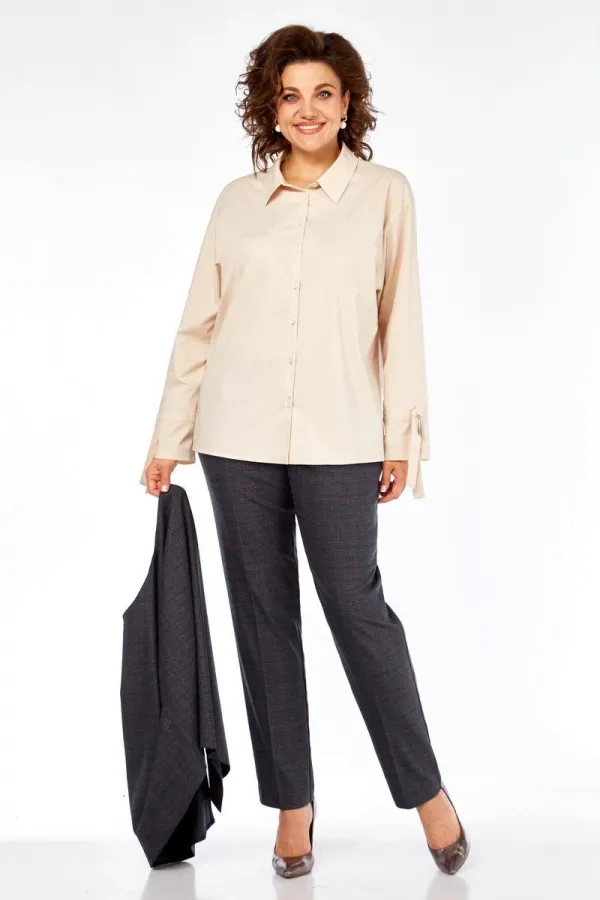 Комплект женский состоящий из рубашки, жилета и брюк. Рубашка прямого силуэта с рубашечным воротником, спереди на застежку – петли и пуговицы, со втачным рубашечным рукавом, по низу рукава – отделочный элемент.Жилетка св... Читать далее...