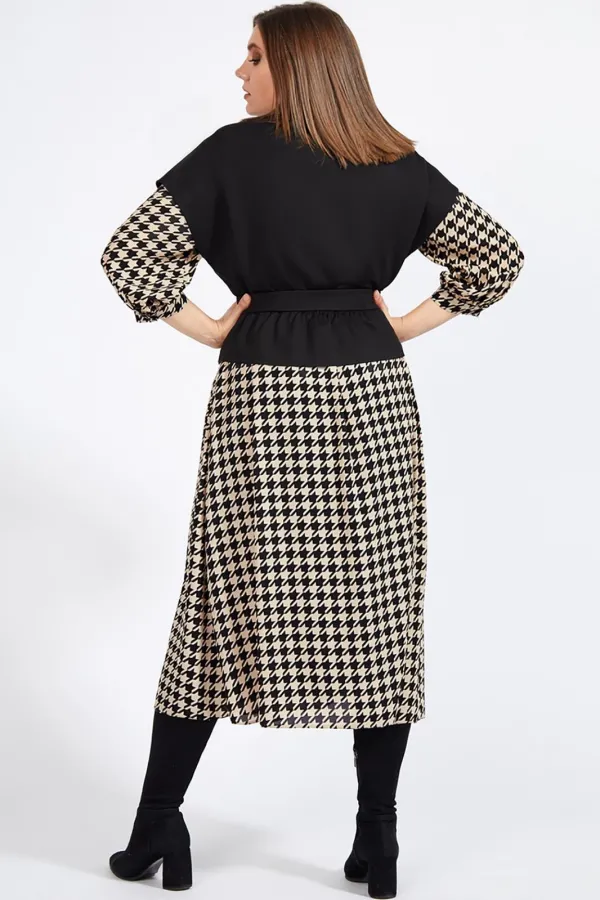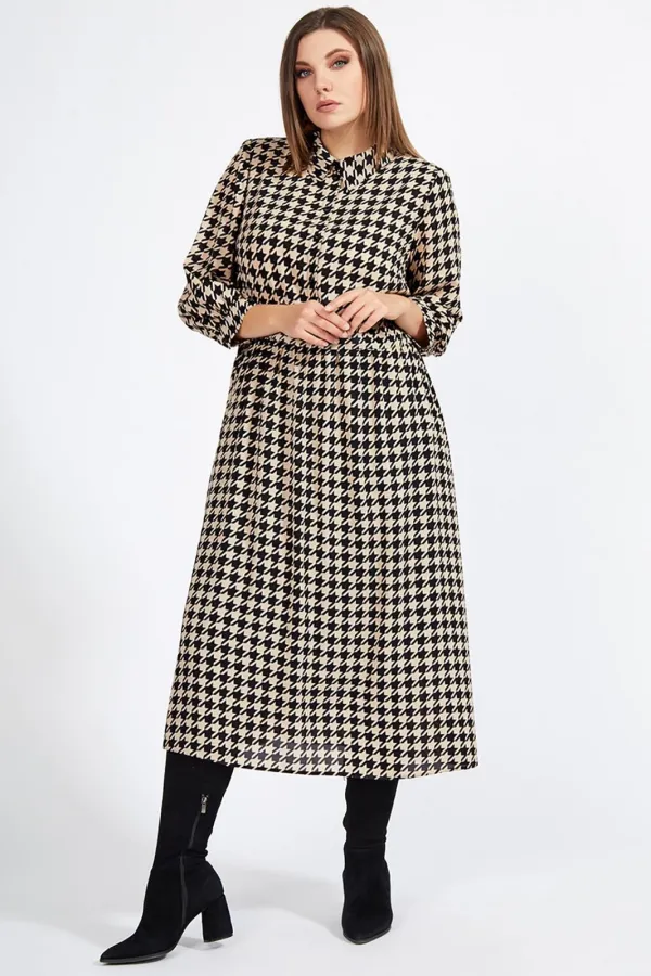 Комплект женский, состоящий из платья и жилета. Платье свободного силуэта. Горловина рубашечного типа. Рукав втачной, на манжете. Застёжка по переду до талии на петли-пуговицы. Жилет свободного силуэта, на резинке по тал... Читать далее...