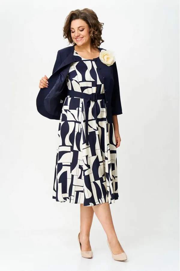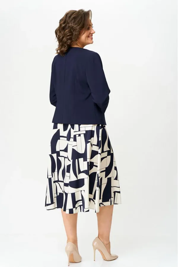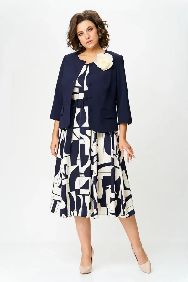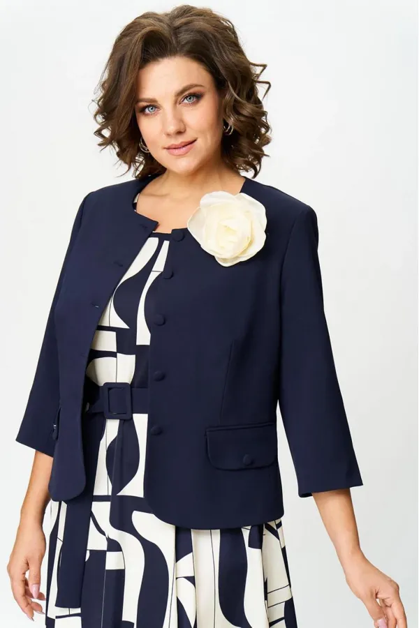 Комплект женский, состоящий из жакета и платья. Жакет приталенного силуэта. Округлый вырез горловины и борта. По полочке-карманы с листочкой и клапанами. Рукав втачной, с разрезами по низу. По переду-застёжка на петли-пу... Читать далее...