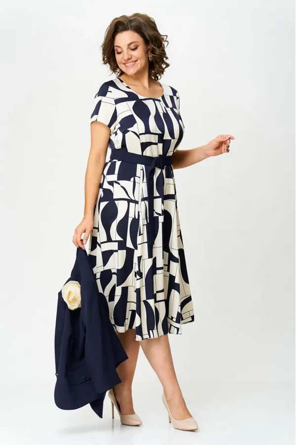 Комплект женский, состоящий из жакета и платья. Жакет приталенного силуэта. Округлый вырез горловины и борта. По полочке-карманы с листочкой и клапанами. Рукав втачной, с разрезами по низу. По переду-застёжка на петли-пуговицы. Жакет без подкладки (летний вариант). Платье приталенного силуэта, со свободной юбкой, на подкладке. Округлый вырез горловины. Рукав втачной, короткий. Застежка на молнию в боковом шве. В комплекте-пояс в цвет жакета. Длина по спинке жакета-53см, длина рукава-30см. Длина по спинке платья-113см, длина рукава-19см