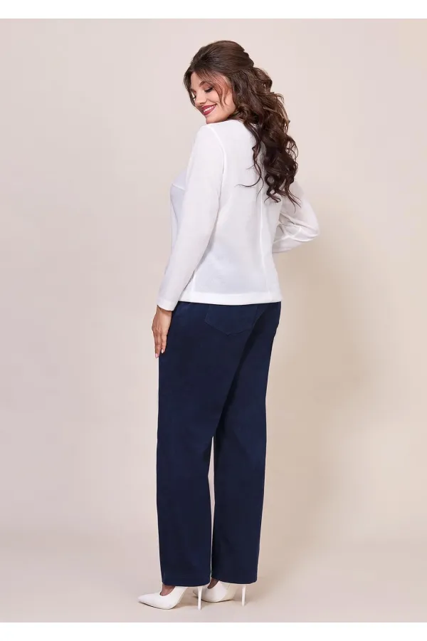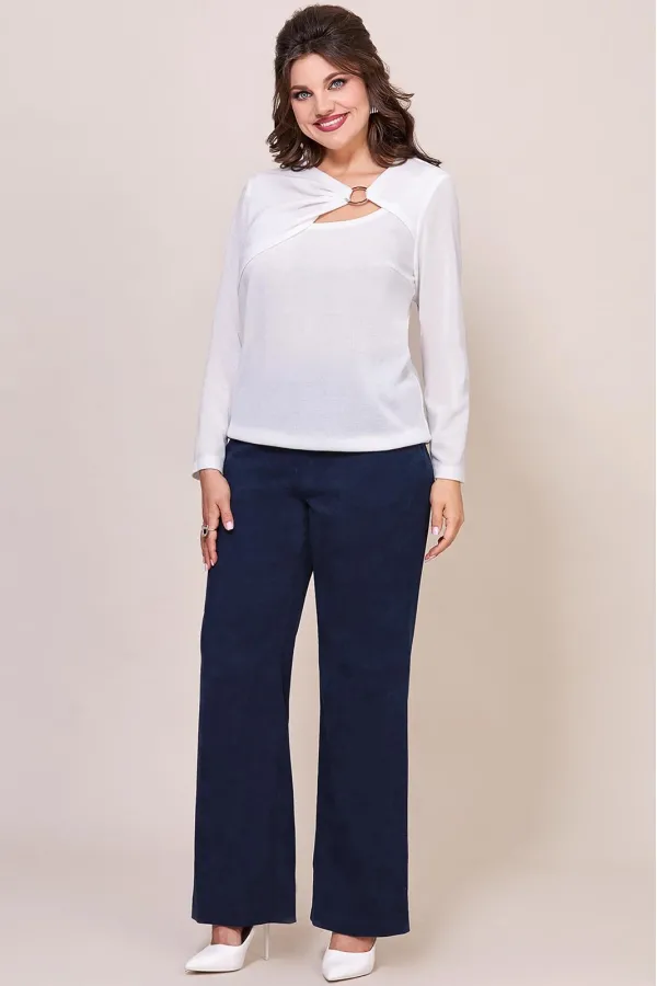 Женский комплект, состоит из блузки и брюк. Блузка выполнена из трикотажного полотна, полу-прилегающего силуэта. Горловина ассиметричной формы, с декором в виде кольца. По полочке обработана ассиметричная кокетка, присборена на кольцо. Нижняя часть блузы выполнена в маечном стиле. Рукав втачной, длинный, спинка из основной ткани. Брюки прямого покроя, на притачном поясе, выполнены из штруксовой ткани. Застежка по переду на молнию, также по переду брюк обработаны карманы в боковых швах. На заднем полотнище брюк обработана кокетка и накладные карманы. Комплект отлично сочетается между собой, также брюки и блузу можно миксовать с другими вещами вашего гардероба, что делает комплект универсальным.