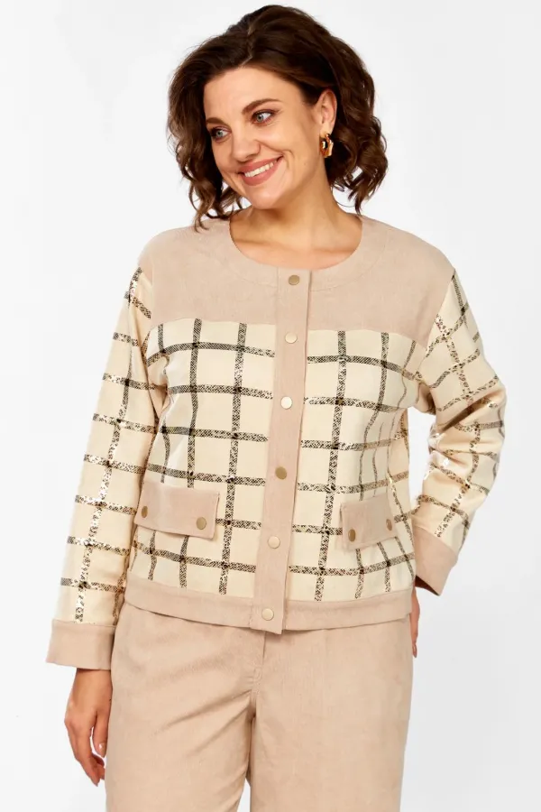 Женский комплект полуприлегающего силуэта, выполнен из штруксовой ткани и замши с принтом. Жакет выполнен из замши с принтом, застежка по переду, на планку с кнопками, горловина округлой формы, на обтачке, обтачка и план... Читать далее...