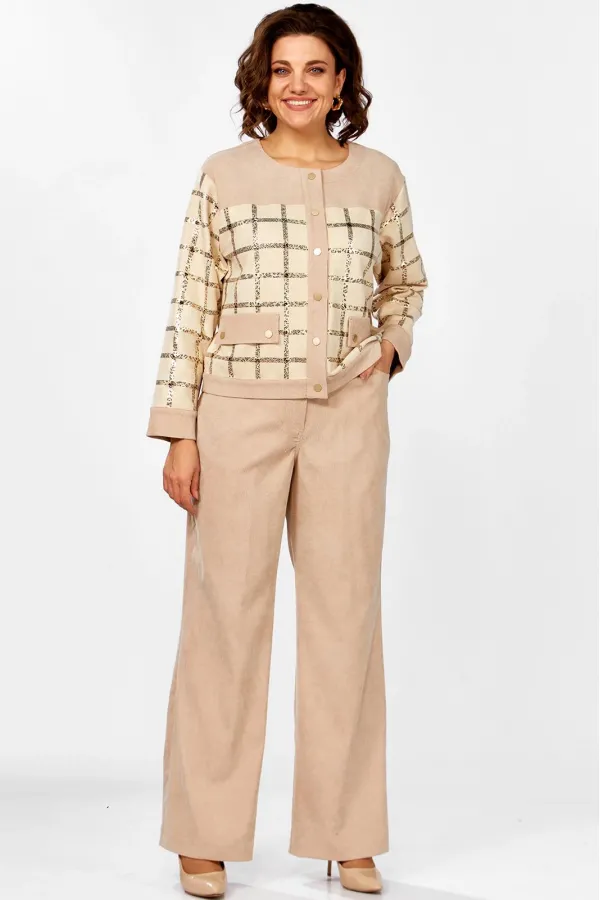 Женский комплект полуприлегающего силуэта, выполнен из штруксовой ткани и замши с принтом. Жакет выполнен из замши с принтом, застежка по переду, на планку с кнопками, горловина округлой формы, на обтачке, обтачка и планка из штрукса. Также на полочке обработаны кокетки из штрукса, также на полочке обработаны клапаны из штрукса, низ жакета обработан притачной планкой из штрукса. Спинка также с кокеткой из штрукса, рукав втачной, длинный, по низу на манжете из штрукса. Брюки выполнены из штрукса, прямого покроя, верхний срез обработан притачным поясом. Застежка по переду на молнию-пуговицу, в боковых швах карманы. Стильный комплект отличный выбор для осеннего образа!