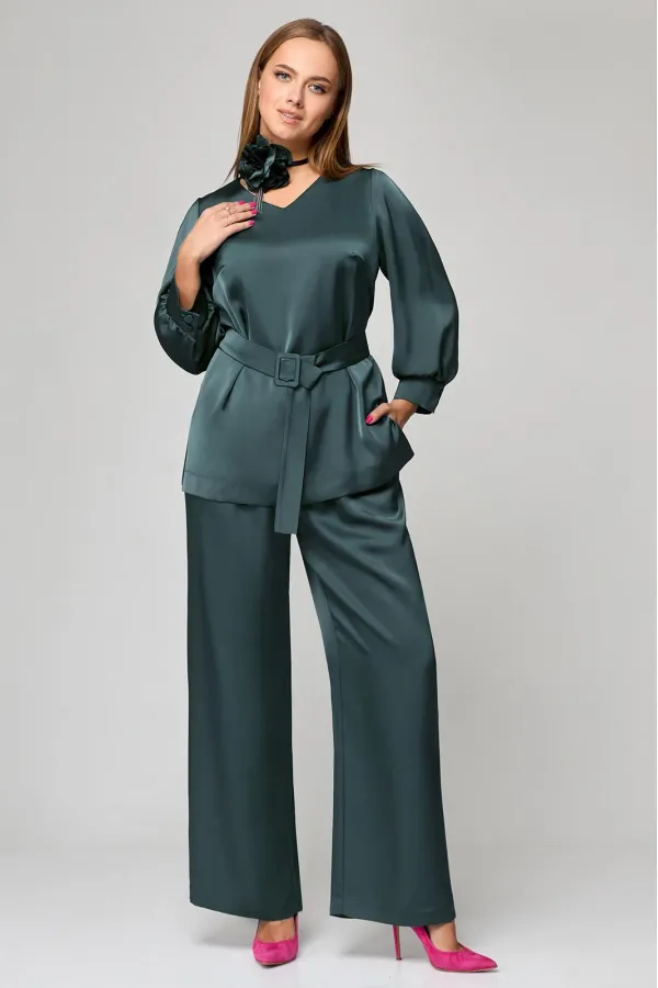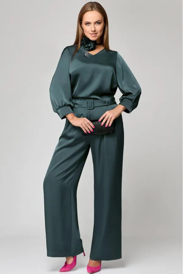 Комплект женский двухпредметный. Блузка - прямого силуэта с V-образным вырезом горловины. По спинке застежка на 3-петли и пуговицы. В боковых швах разрезы. Рукав втачной со складкой по низу с манжетой. Брюки классического покроя, прямые от бедра. В боковых швах карманы с отрезными бочками. Пояс отрезной со шлевками. Застежка на молнию и петлю с пуговицей. Изделие дополнено съемным поясом из основной ткани на пряжке. Длина блузки 69 см, длина рукава 52 см, длина брюк 106 см. Украшение в комплект не входит.