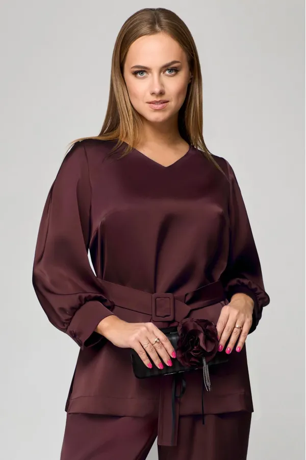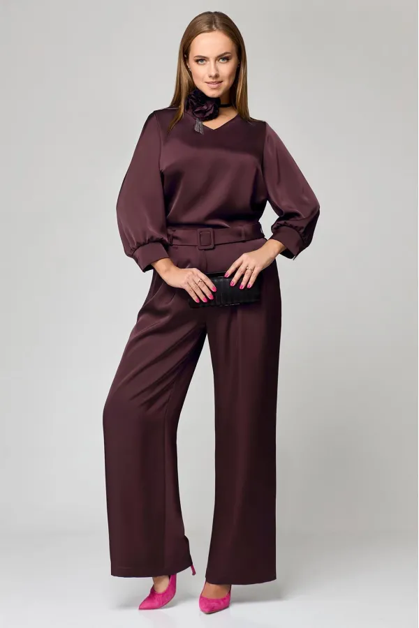 Комплект женский двухпредметный. Блузка - прямого силуэта с V-образным вырезом горловины. По спинке застежка на 3-петли и пуговицы. В боковых швах разрезы. Рукав втачной со складкой по низу с манжетой. Брюки классического покроя, прямые от бедра. В боковых швах карманы с отрезными бочками. Пояс отрезной со шлевками. Застежка на молнию и петлю с пуговицей. Изделие дополнено съемным поясом из основной ткани на пряжке. Длина блузки 69 см, длина рукава 52 см, длина брюк 106 см. Украшение в комплект не входит.