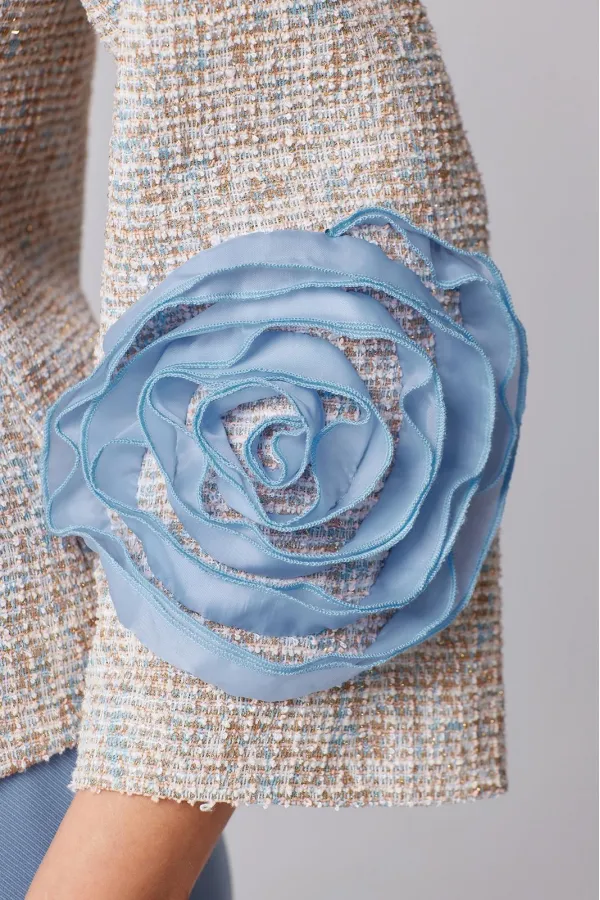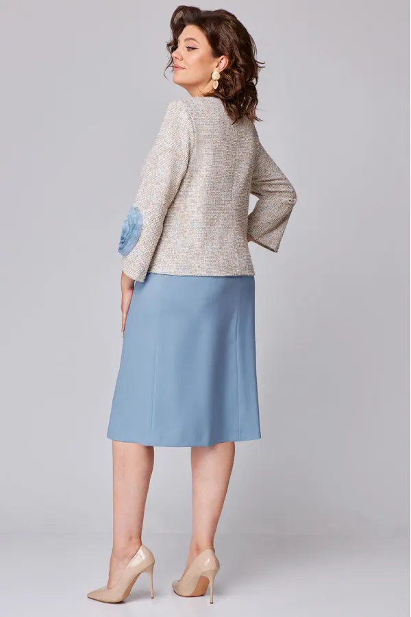 Комплект женский, двухпредметный, состоящий из туники и юбки. Блузка прямого силуэта из трикотажного полотна «шанель», с нагрудными вытачками из бокового шва. Рукав втачной одношовный, расширенный к низу. По левому рукаву декоративный элемент в виде цветка. Горловина округлой формы, обработана обтачкой с перекантом. Спинка со средним швом. Юбка из текстильной ткани, А-образного силуэта, на подкладке, с застежкой в среднем шве заднего полотнища. Верхний срез обработан обтачкой. Длина туники по спинке 55см. Длина рукава 52см. Длина юбки по боковому шву 67см.